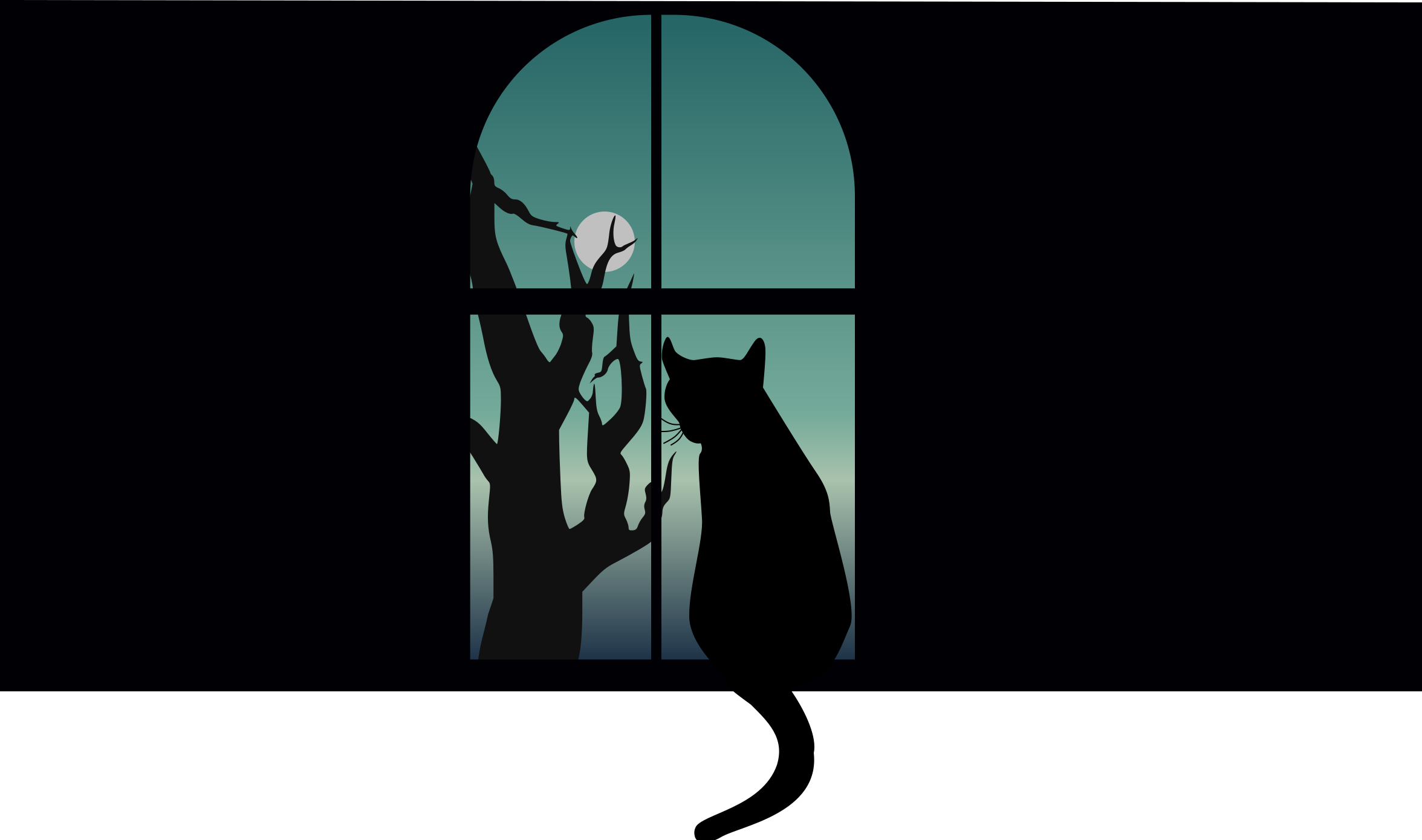 This features a black cat sitting in front of an open window, looking out into the night. The cat is positioned near the center of the scene and appears to be observing something outside. Above the cat, there is a silhouette of a tree with a moon visible in the sky. This creates a captivating and mysterious atmosphere as the cat looks on from its perch at the window. The combination of the cat's gaze, the tree's branches, and the moon's glow all contribute to an intriguing visual experience.