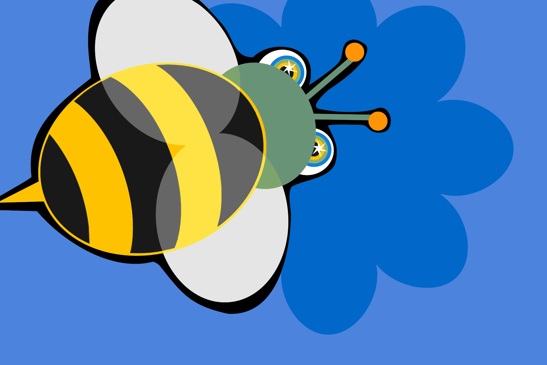 This features a cartoon bee with a yellow body and black wings, sitting on top of a blue flower. The bee is the main focus of the scene, occupying most of the frame. The flower has a white background, which contrasts nicely with the vibrant colors of the bee. This whimsical illustration creates an interesting visual effect that captures the viewer's attention.