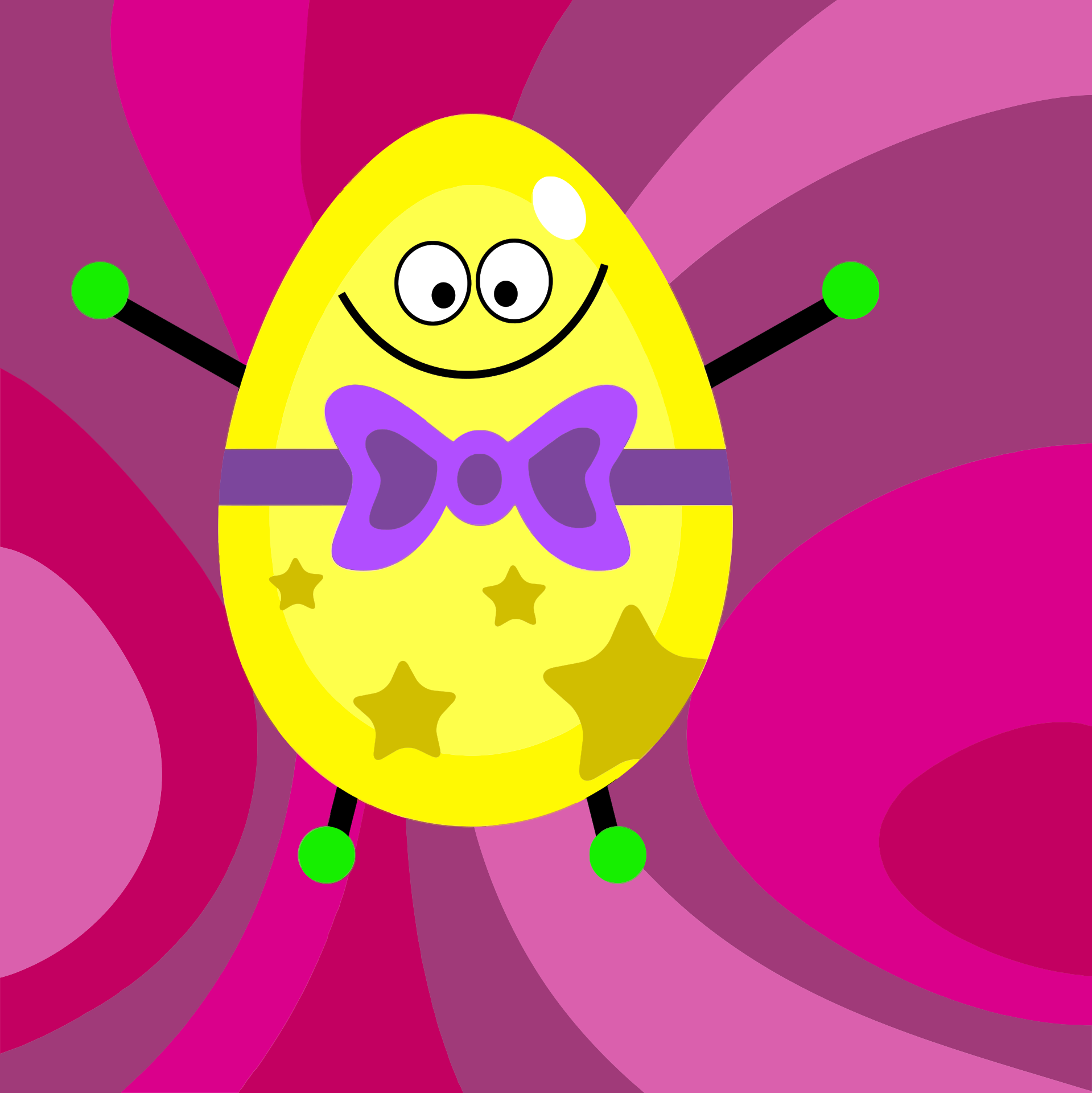 This features a cartoon character, resembling an egg with a bow tie and stars on it. This character is holding its arms out wide, giving the impression of being happy or excited. The colorful design of the egg adds to the playful atmosphere of the scene. The overall composition of the image creates a sense of fun and joy, making it an appealing visual for children or anyone who enjoys lighthearted illustrations.