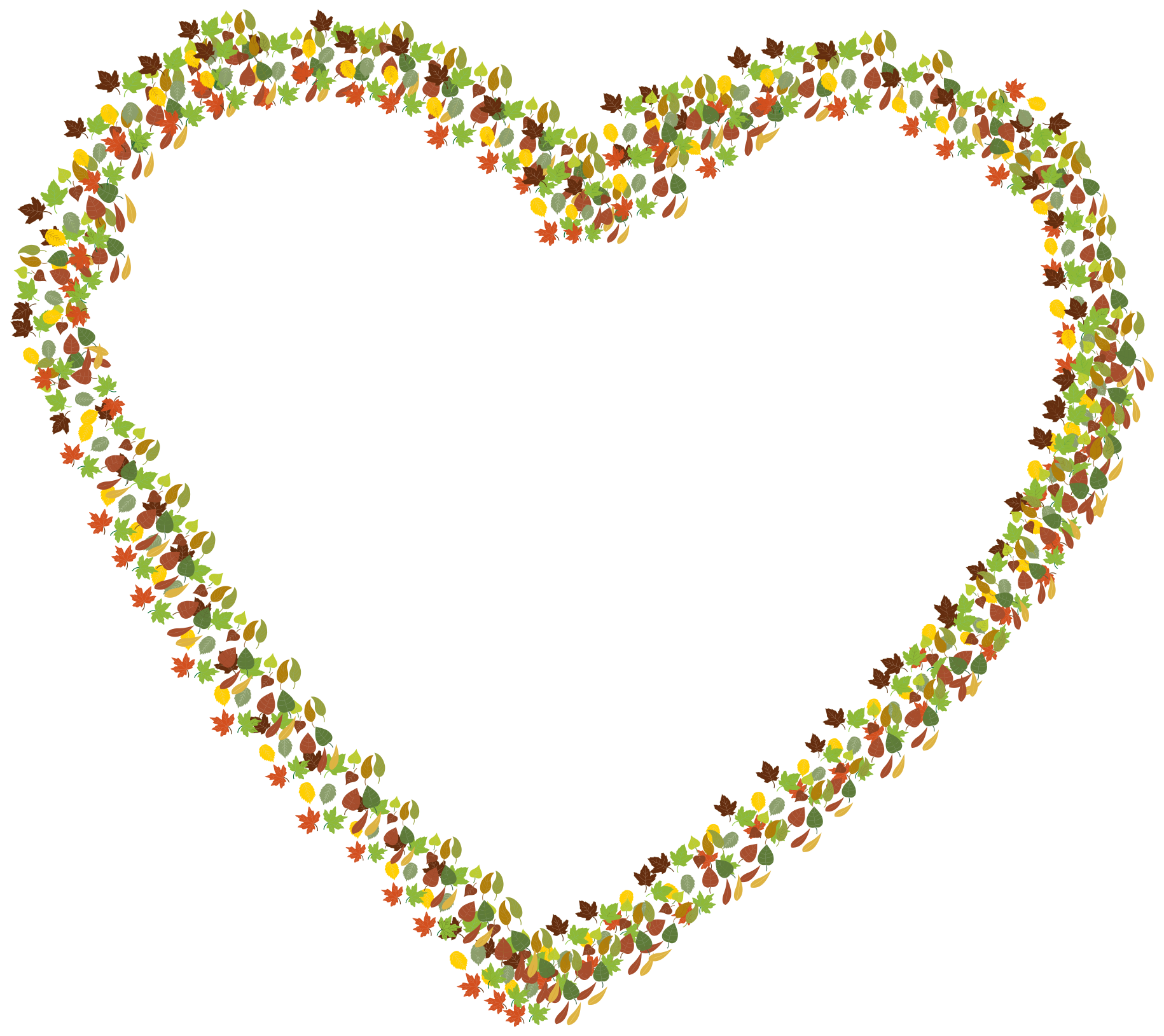 This features a heart-shaped design made up of various leaves and branches. The heart is filled with different types of leaves, creating an intricate pattern that covers the entire shape. The leaves are arranged in such a way that they fill the space within the heart, giving it a full and vibrant appearance. This unique design showcases the beauty of nature and its ability to create visually appealing patterns.