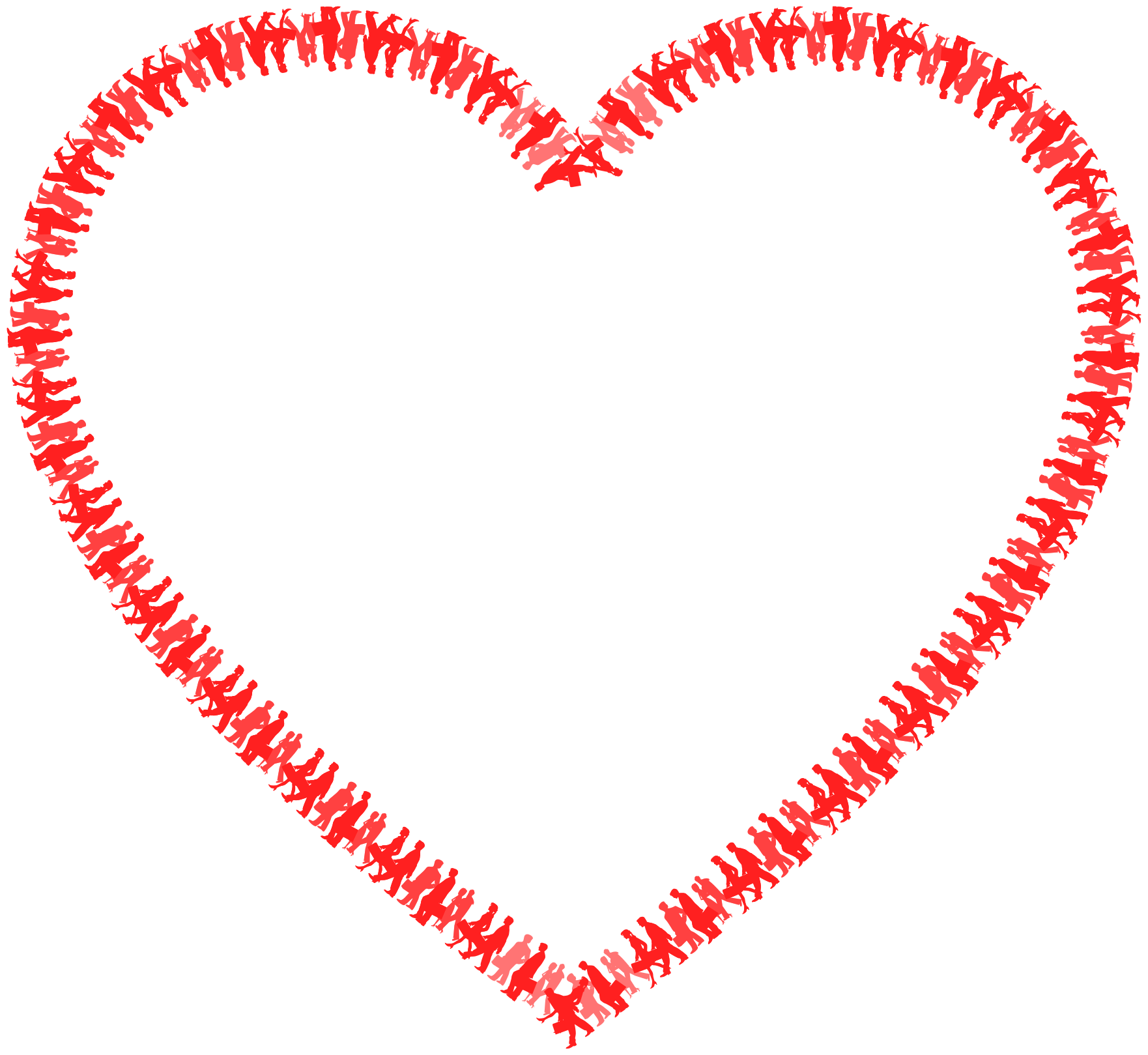 This features a large, white heart shape made up of numerous red and light pink figures. These figures are arranged in such a way that they form the outline of the heart, creating an eye-catching display. The heart is prominently displayed on a red background, which adds to its visual appeal. This creative arrangement of figures can be seen as a unique and artistic representation of love or affection.