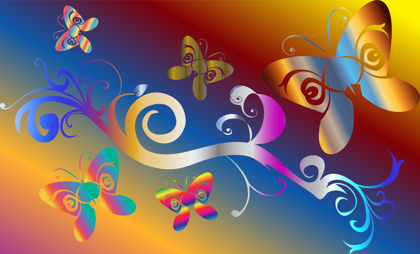 This features a colorful and vibrant scene with several butterflies flying in the air. There are five distinct butterfly shapes, each varying in size and position within the frame. Some of these butterflies are located towards the top left corner, while others can be seen in the middle and bottom right areas of the image. The overall atmosphere is lively and full of energy, with the butterflies creating a sense of motion and freedom.