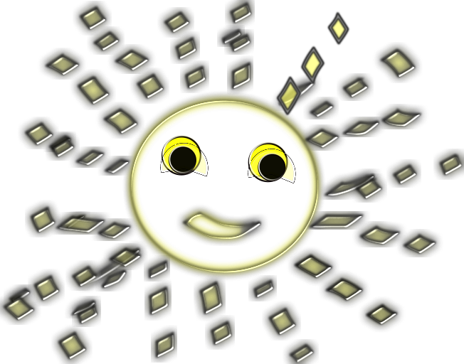 This features a yellow sun with two black eyes and a smile on its face. It appears to be made of various shapes, including circles and squares, giving it a unique and playful appearance. The sun is surrounded by numerous small circles, which are scattered throughout the scene in different sizes and positions. These circles add depth and interest to the overall composition of the image, creating an engaging visual effect.