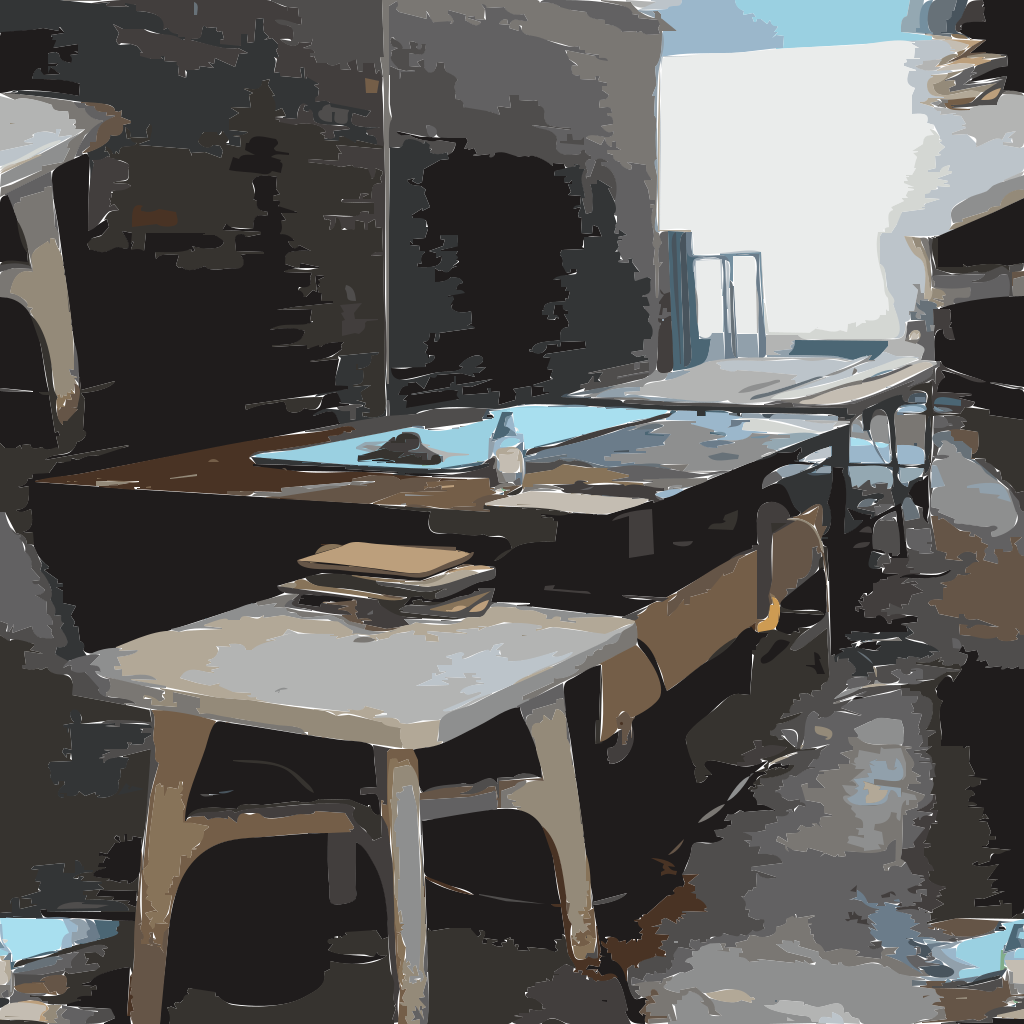 This depicts a room with a wooden table and chairs. On the table, there are several books scattered around, along with a bottle placed in the middle of them. A cup is also present on the table. In addition to the main table, there is another smaller dining table located towards the right side of the room. The overall setting appears to be an office or workspace environment.