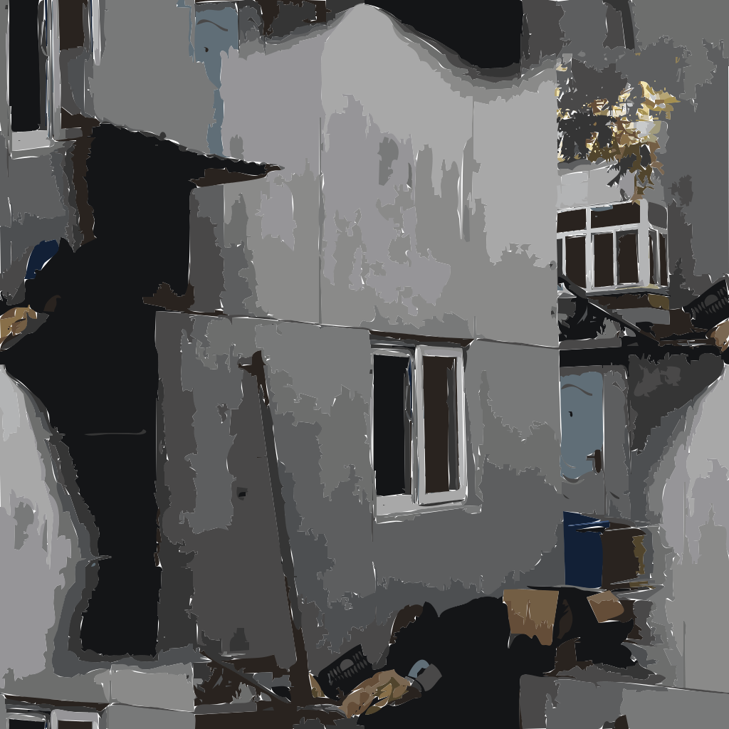 This features a building with a window and a door. A ladder is leaning against the wall, possibly for maintenance or cleaning purposes. There are two windows in the scene, one on the left side of the building and another on the right side. Additionally, there is a chair located near the bottom-right corner of the image. The overall setting appears to be an urban environment with various elements present.