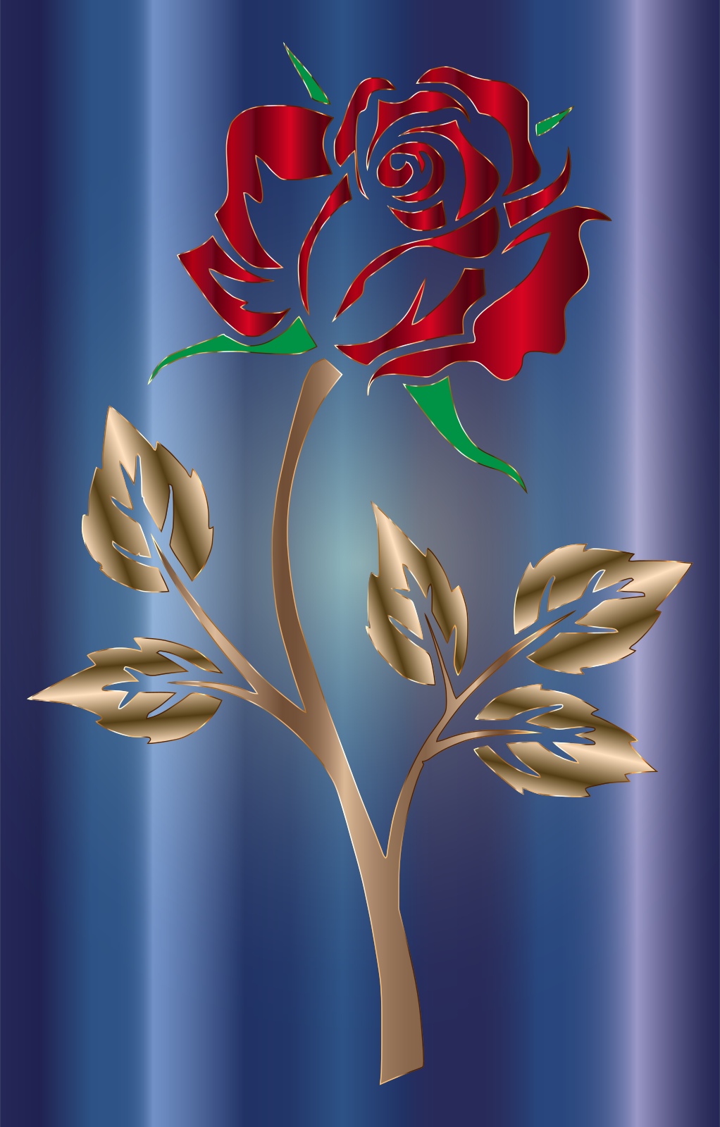This features a close-up of a single red rose with green leaves, placed against a blue background. The rose is the main focus of the scene and appears to be in full bloom. The leaves surrounding the rose are intricately detailed, adding depth and texture to the overall composition. The blue background provides a contrasting color that highlights the vibrant red hue of the rose, making it stand out even more prominently.