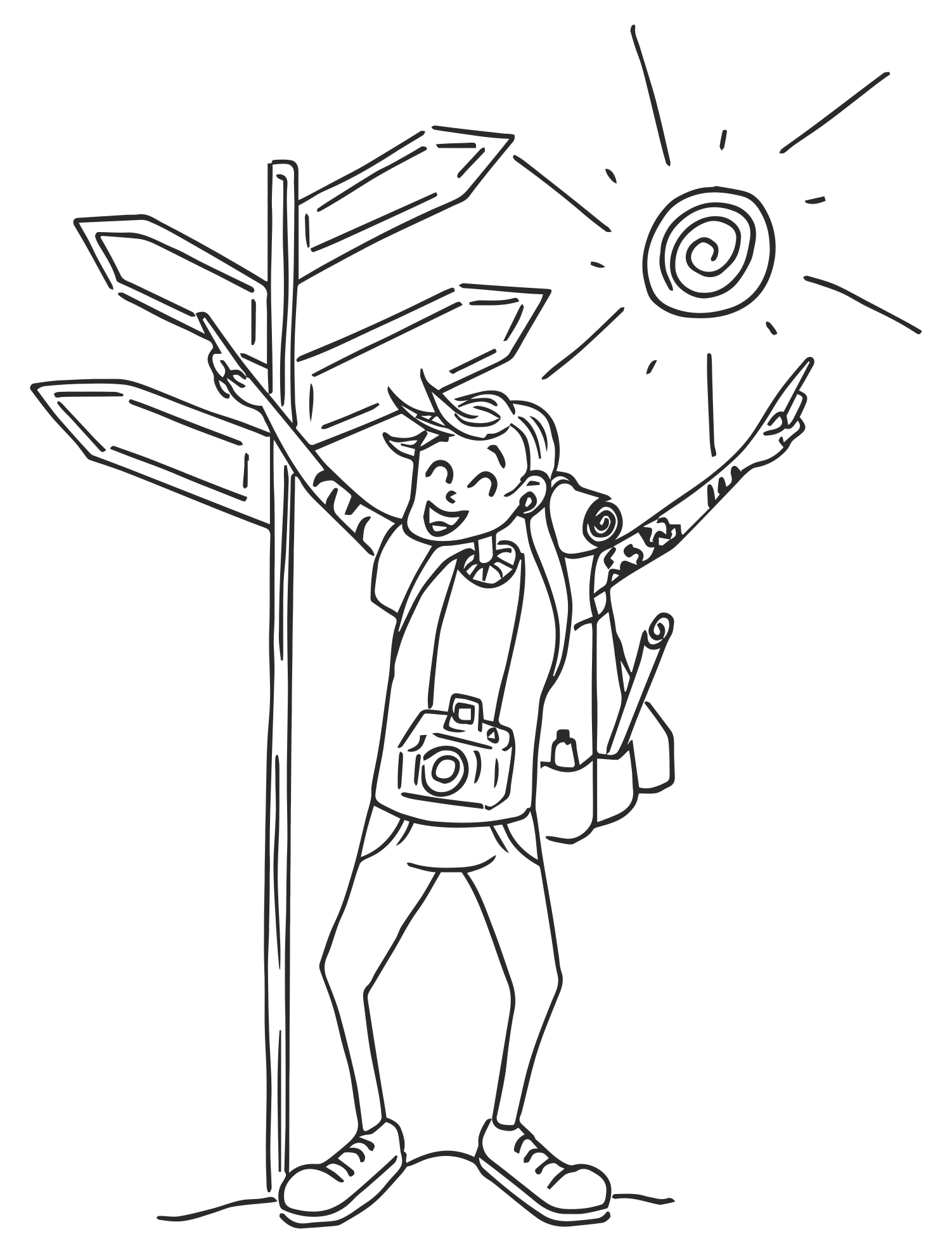 Tags: black and white, boy, happy, line art, male, man, semi-realistic people, sign post, traveler, drawing, sketch, artwork, cartoon, comic, colorless, silhouette, shadow, outline, arrow, sun, frisbee, traveler happy