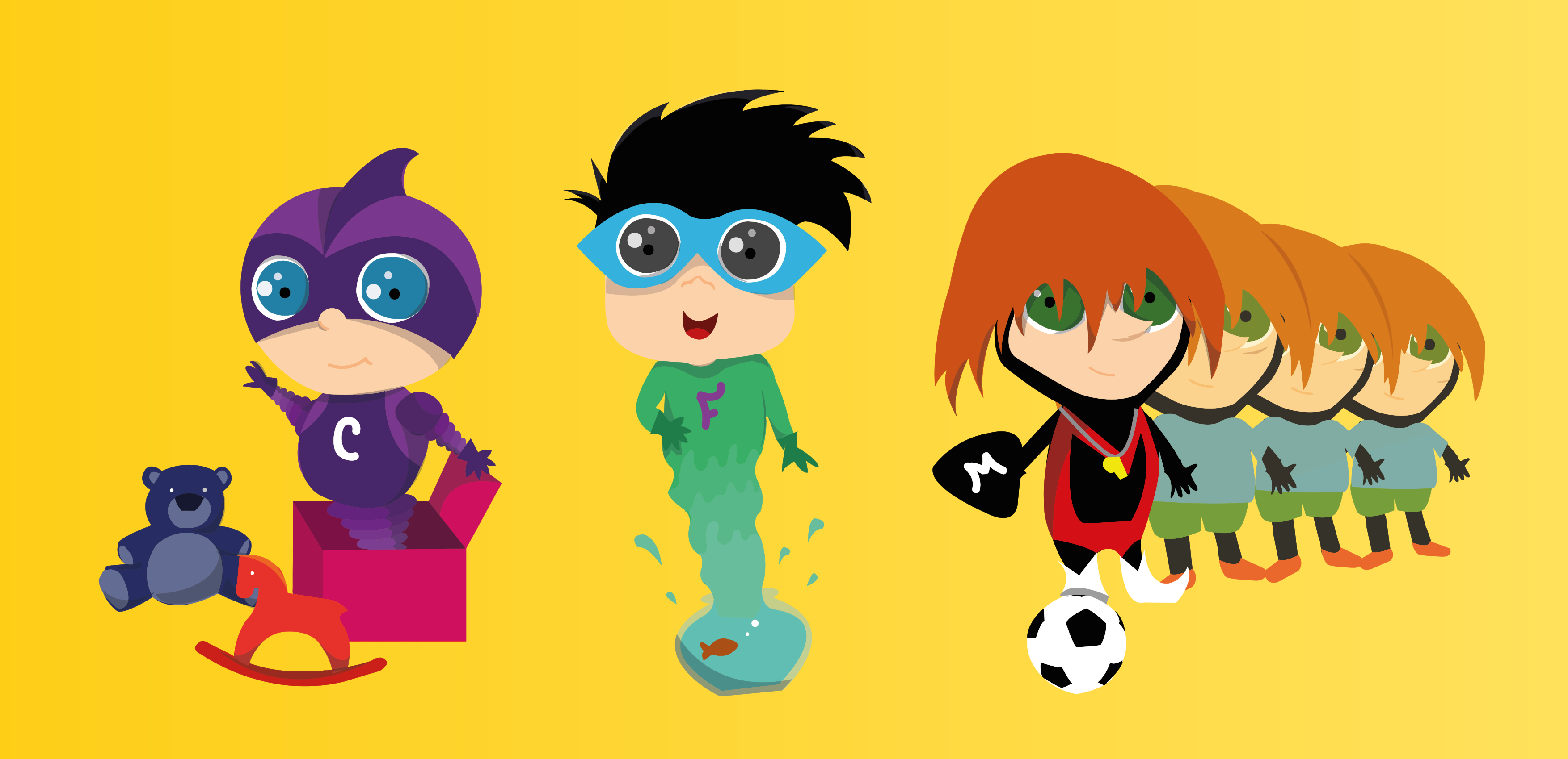 This features a group of cartoon characters standing next to each other on a yellow background. There are five main characters in the scene, with one character wearing a purple costume and another dressed as a superhero. A soccer ball is also present in the scene, located near the right side of the image. In addition to the main group of cartoon characters, there are several other smaller figures scattered throughout the background. These figures appear to be part of the same comic book or animated series as the main characters. The overall composition of the image creates a lively and engaging atmosphere for viewers.