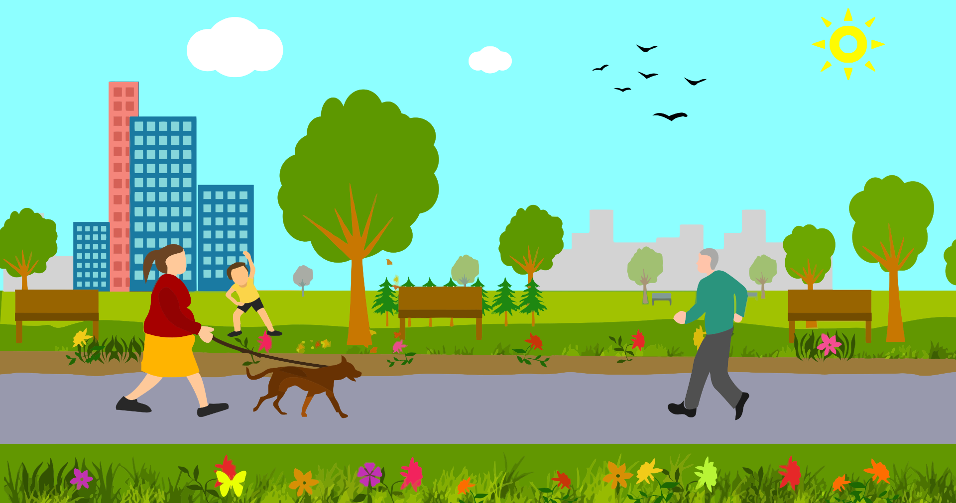 This depicts a lively scene of people walking their dog along a path in a park. There are three individuals visible, with one person on the left side and two others closer to the center of the image. A small brown dog is being walked by its owner, who is holding it on a leash. The dog appears to be enjoying the walk as well. In addition to the people and their dog, there are several birds flying in the sky above the park, adding to the overall atmosphere of the scene. There are also two benches visible in the image, one located near the left side and another further back on the right side. The presence of these benches suggests that this is a popular spot for people to relax and enjoy the outdoors with their pets.