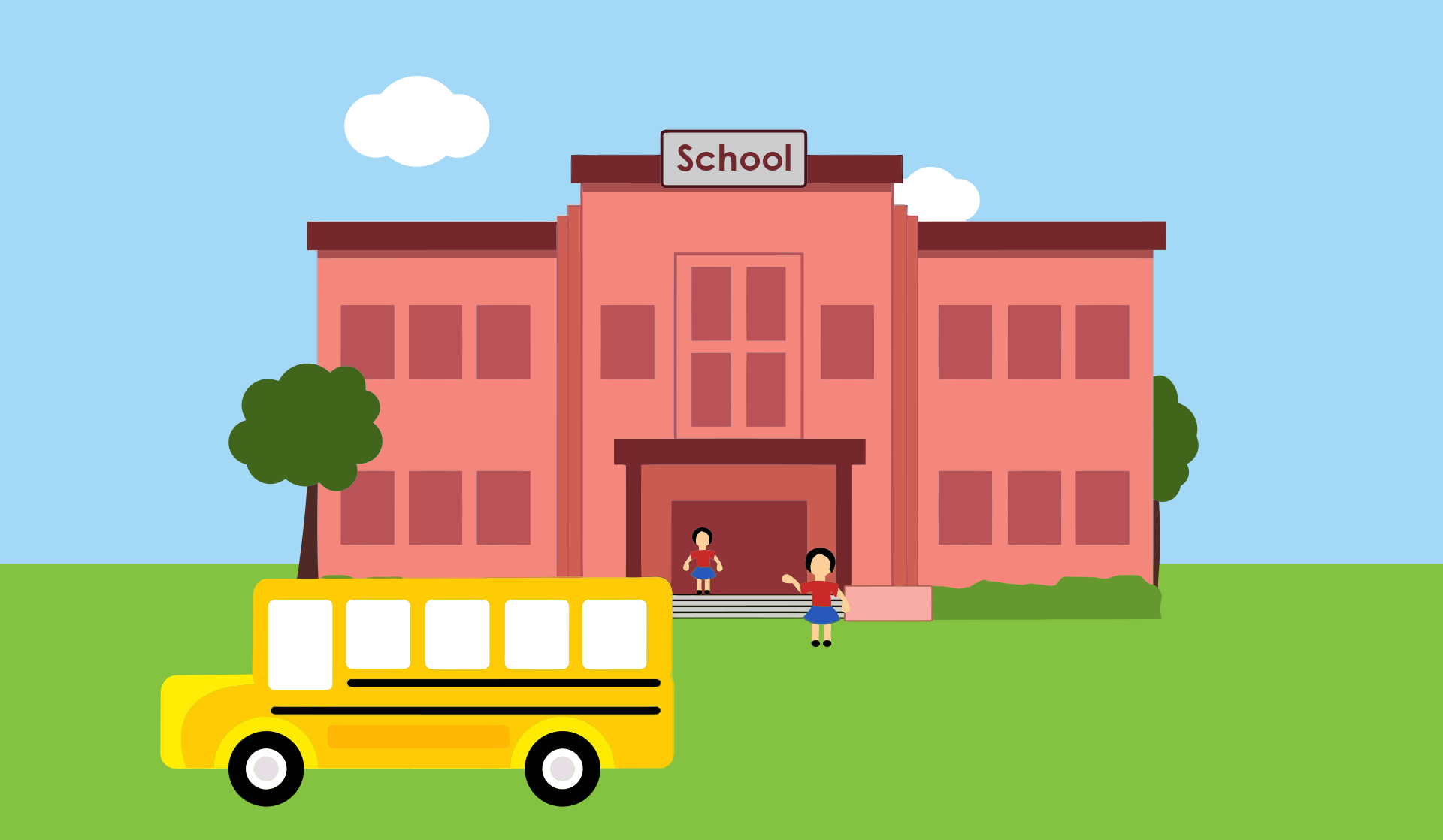 This features a school with a large red building, which is the main focus of the scene. In front of this building, there is a yellow school bus parked, likely waiting to pick up students. Two children can be seen walking towards the entrance of the school, possibly getting ready for their day or just arriving at the campus. The overall atmosphere suggests a typical day at an elementary school with students and staff going about their daily routines.