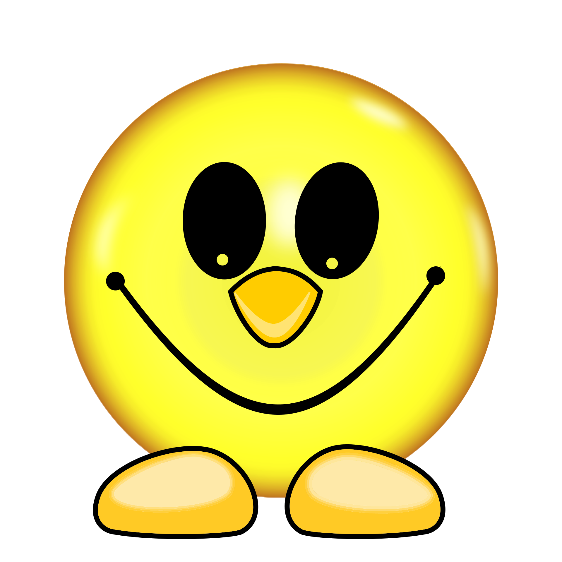 This features a yellow smiley face with black eyes and a beak. It is sitting on the ground, possibly in front of a white background. The smiley face has a playful and cheerful appearance, making it an appealing and positive symbol. Its bright color and simple design make it easily recognizable and universally understood as a representation of happiness or positivity.