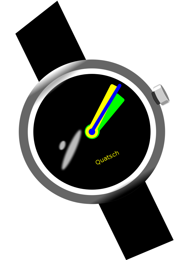 This features a watch with a black face and colored pointers, including green, yellow, and blue. These pointers are positioned around the center of the watch, allowing the user to adjust the time according to their preferences. The watch is designed in such a way that it can be easily turned for optimal viewing angles. This unique design makes it an interesting and functional accessory for those who appreciate both style and functionality.