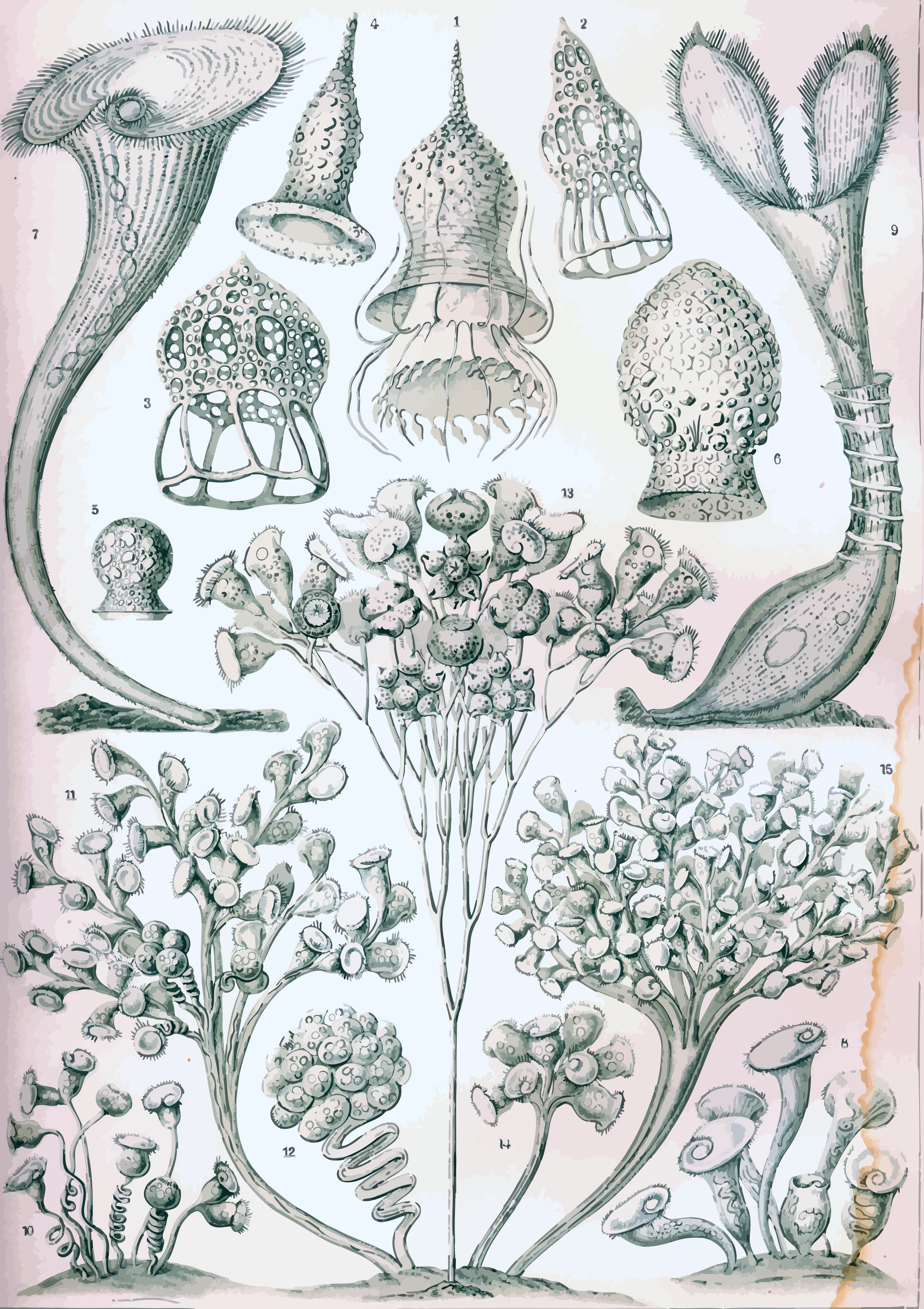 This is a black and white drawing of various plants, flowers, and other natural elements. There are several different types of flowers displayed in the drawing, including some that resemble mushrooms or other unusual shapes. In addition to the flowers, there are also drawings of leaves, ferns, and other plant-like structures. The overall composition of the image is quite intricate, with each element carefully detailed and arranged within the frame. This artwork could be a representation of Ernst Haeckel's famous book "Kunstformen der Natur," which showcases the beauty and diversity of natural forms found in the world around us.
