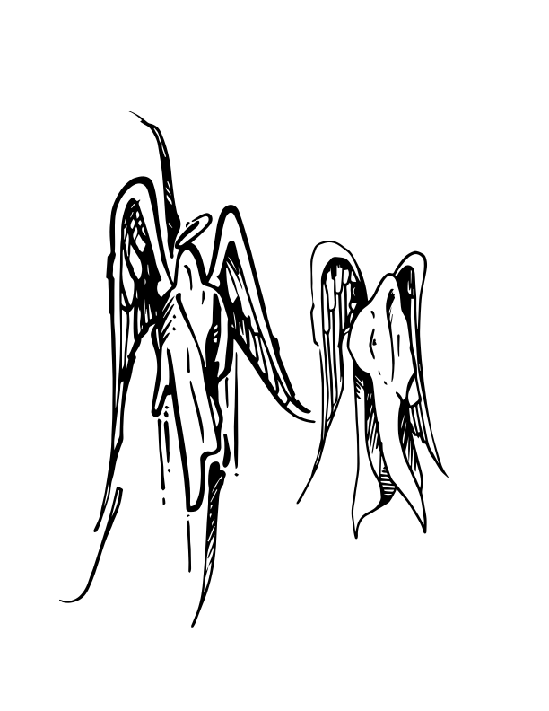 This features two black and white drawings of angels, one on the left side and another on the right. Both angels have wings spread out, giving them a majestic appearance. They are positioned close to each other, with their wings overlapping slightly. The drawing style is reminiscent of a sketch or a doodle, adding an artistic touch to the image.