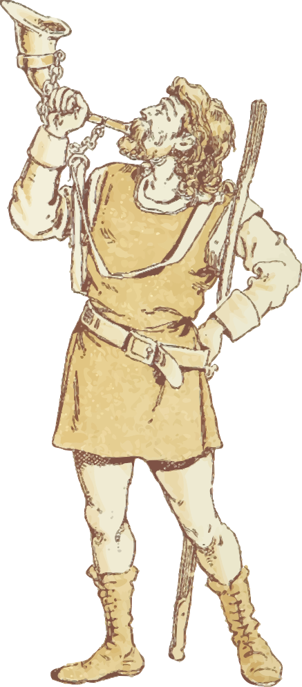 This features a man dressed in medieval clothing, holding a trumpet to his mouth. He appears to be a knight or warrior, possibly from the Middle Ages. The man is wearing a helmet and has a sword on his side. In addition to the trumpet, he also holds a shield, which further emphasizes his role as a warrior. The scene captures an artistic representation of medieval times, showcasing the knight's bravery and skill in battle.