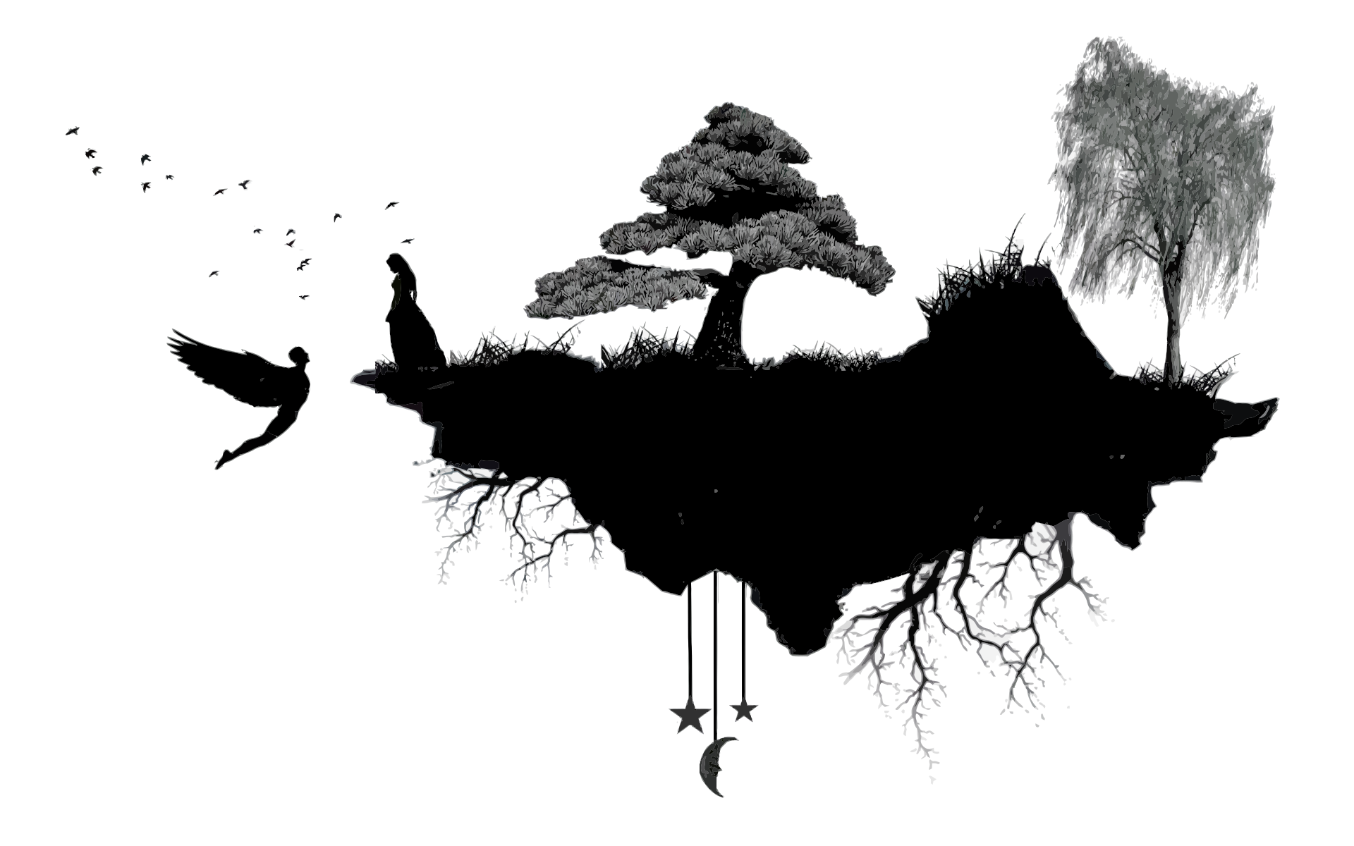 This features a black and white illustration of an island with trees, a woman, and a bird. The woman is standing on the edge of the island, while the bird is flying next to her. There are two trees in the scene, one located near the center of the island and another towards the right side. The overall composition creates a sense of fantasy and wonder, as if the viewer has stumbled upon an enchanted world.