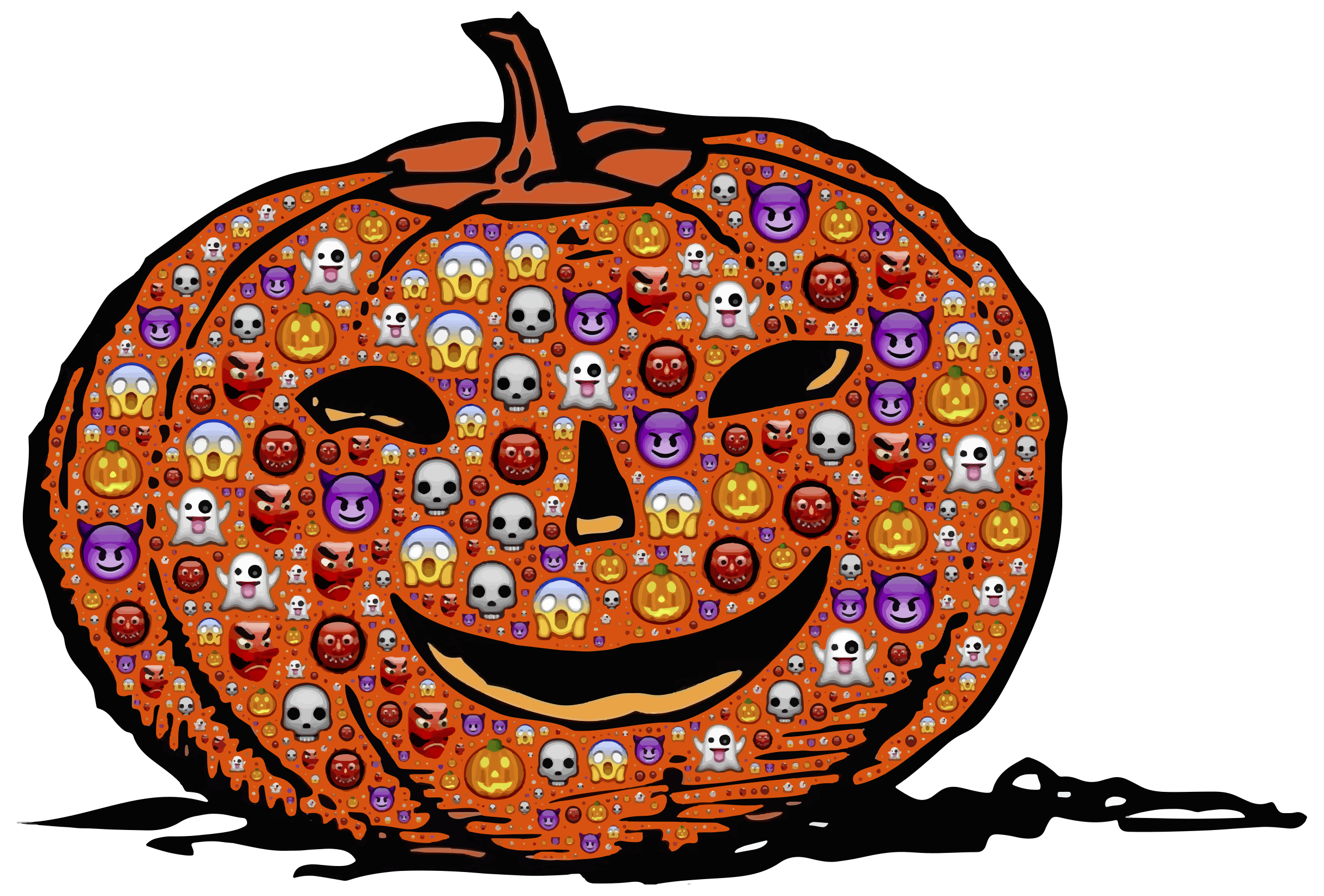 This features a large, colorful pumpkin with a smiling face. It is covered in various stickers and emojis, giving it a playful appearance. The pumpkin has a prominent smile on its surface, making it an eye-catching centerpiece for any setting. The stickers are scattered all over the pumpkin, adding to its vibrant and lively look. This unique decoration is sure to bring joy and amusement to anyone who sees it.