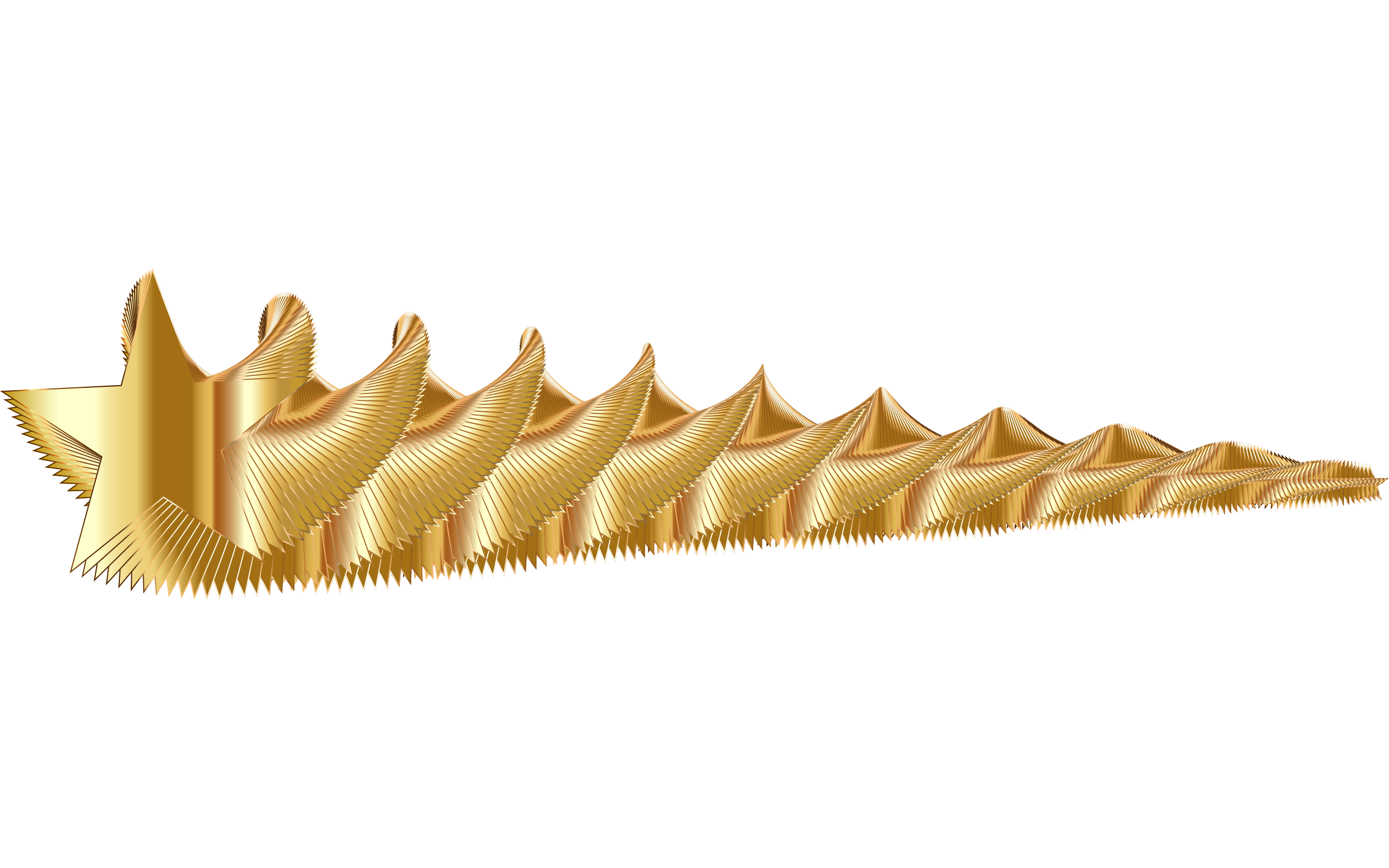 This features a large, golden star with multiple points. It is an intricate and ornate design that resembles a mountain range or a series of peaks. The star has a unique shape, giving it a distinctive appearance. Its gold color adds to its elegance and makes it stand out against the white background on which it rests. This artistic piece could be used as a decorative element in various settings, such as homes, offices, or events.