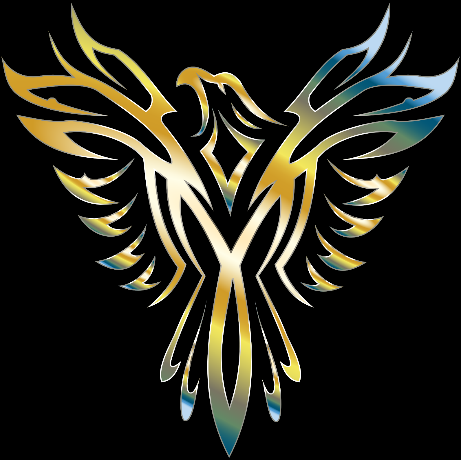 This features a large, colorful bird with its wings spread wide. The bird is adorned in gold and blue colors, creating an eye-catching design. Its wings are open, showcasing the intricate details of the feathers. The bird's wingspan covers most of the frame, making it the focal point of the image. This artistic representation of a bird could be used as a logo or decorative element in various settings.
