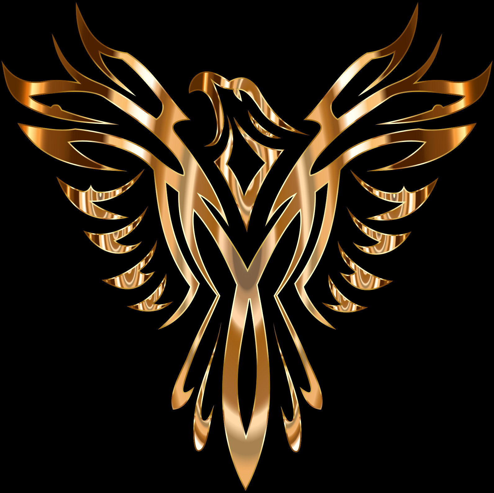 This features a large, ornate golden bird with its wings spread wide. The bird's wings are adorned with intricate designs and patterns, giving it an impressive appearance. The background of the image is black, which contrasts well with the gold color of the bird, making it stand out even more. This design could be used for various purposes such as a logo or decorative artwork, showcasing its beauty and elegance.