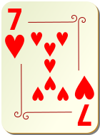 This features a deck of cards with the number seven on it. The card is red and has hearts all over it, making it an interesting and unique design. There are several hearts scattered across the card, some in the corners and others in the middle. This particular card appears to be a part of a larger collection or set, as indicated by its distinctive appearance compared to traditional playing cards.