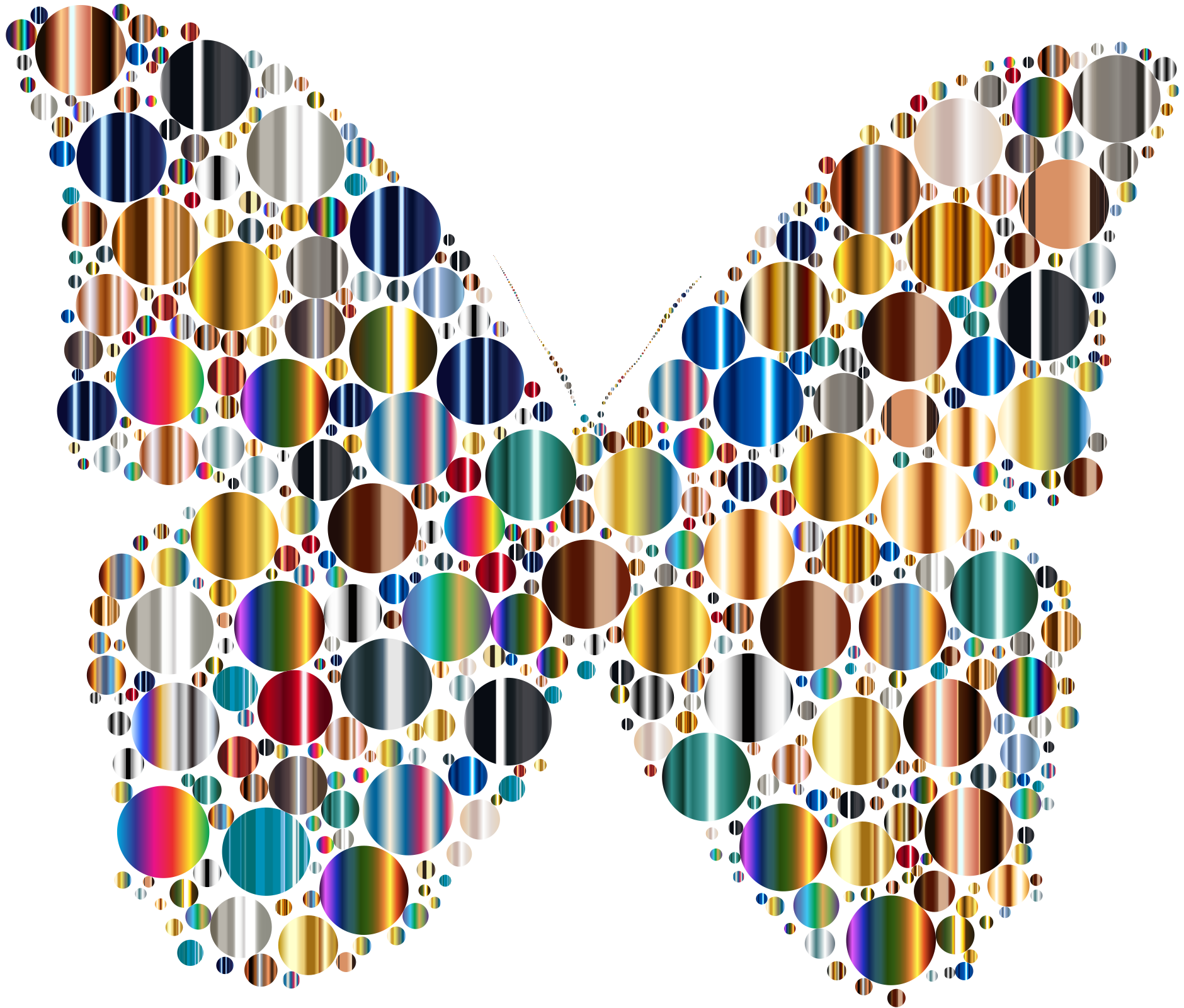 This features a large, colorful butterfly made up of various colored circles. These circles are arranged in such a way that they form the wings and body of the butterfly. The colors used for this artwork include red, blue, yellow, orange, green, purple, and black. The butterfly is positioned towards the left side of the image, with its wings extending across most of the frame. This creative representation of a butterfly showcases the artist's skill in combining different colors to create an eye-catching visual effect.