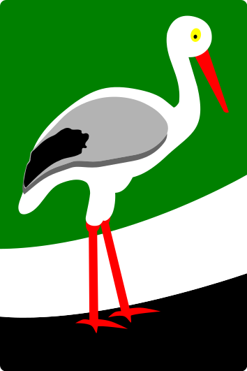 This features a large bird, possibly a stork or an egret, standing on the ground. It is positioned in front of a green and white background, which creates a striking contrast with its colorful plumage. The bird's long legs are prominently displayed as it stands tall on the pavement. Its beak appears to be slightly open, possibly indicating that it is either resting or preparing to take flight. Overall, the image captures the beauty and elegance of this majestic creature in its natural habitat.