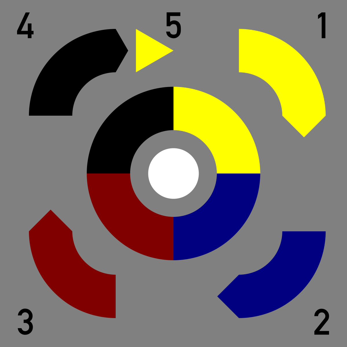 This features a circular design with various colors, including red, yellow, and blue. There are three numbers in the center of the circle, which appear to be 4, 6, and 1. Additionally, there is a small dot located near the center of the circle. The overall composition creates an interesting visual effect that combines both geometric shapes and colors.