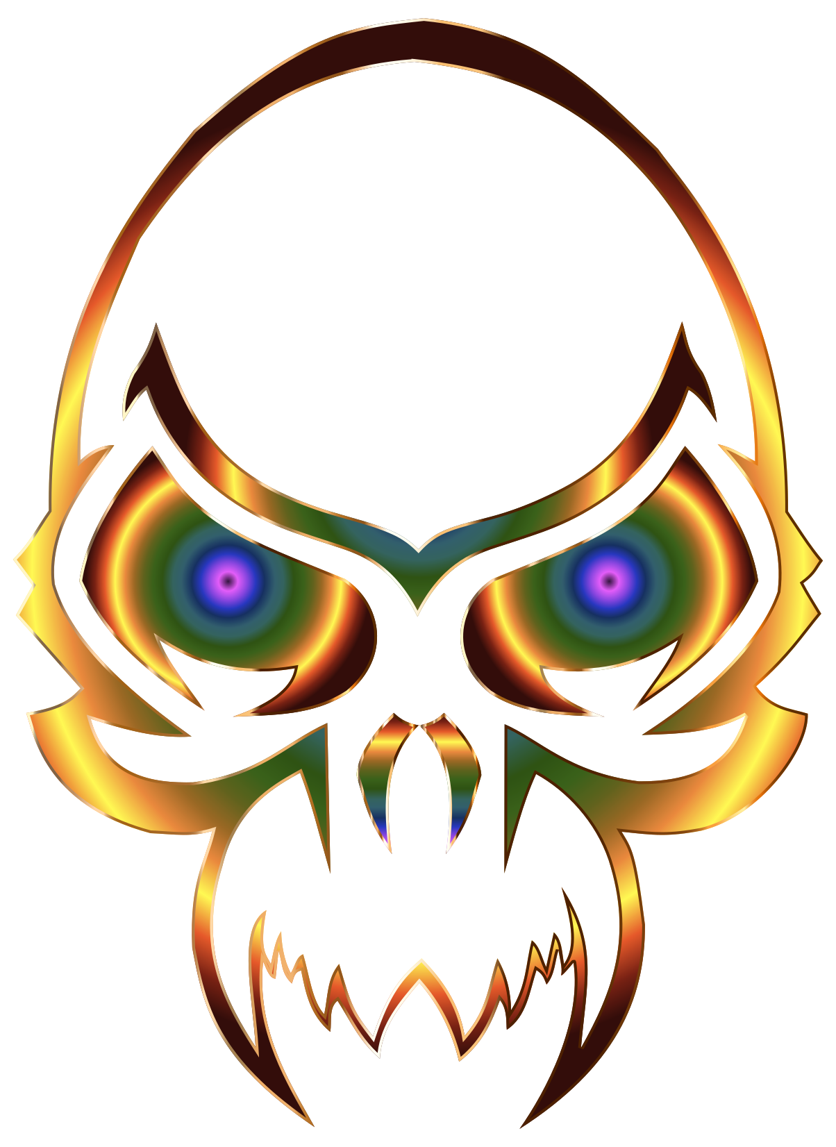 This features a skull with an evil and menacing appearance. It has two eyes, one on the left side of its face and another on the right side. The skull is adorned with a yellow color, giving it a unique and striking look. The design also includes a mouth that adds to the overall creepy vibe of the image. This skull appears to be an intriguing piece of art or decoration, capturing attention due to its unusual appearance.