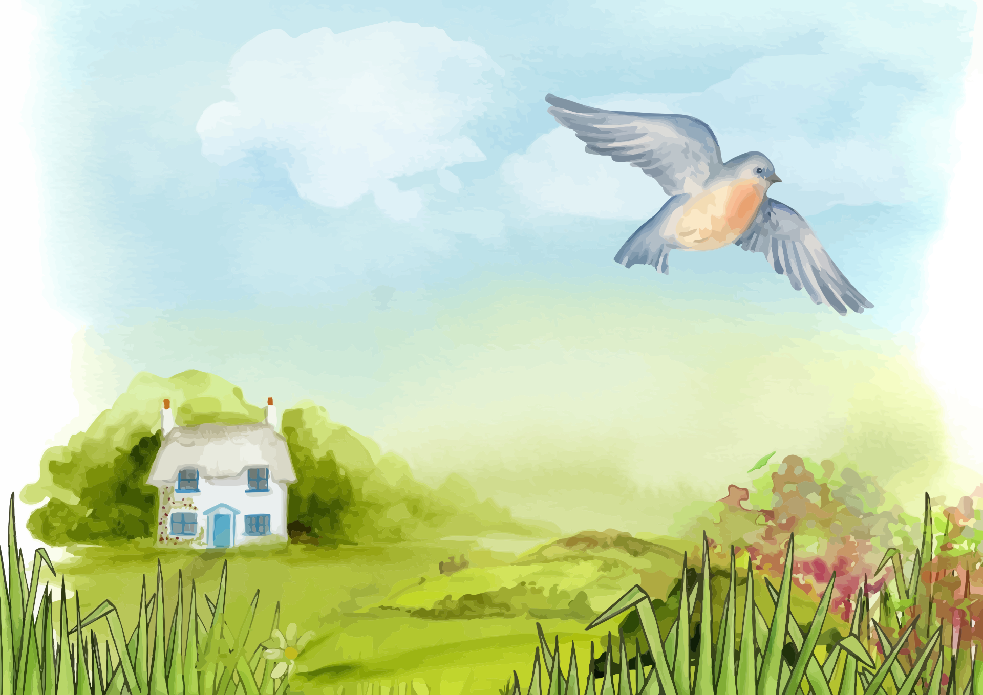 This features a small white house situated on a lush green field. The house has four windows and a blue door, giving it a charming appearance. It is surrounded by a grassy area that extends to the edges of the scene. In the top right corner of the image, there is a bird flying gracefully through the sky, adding life and movement to the serene landscape. This picturesque setting evokes feelings of tranquility and harmony with nature.