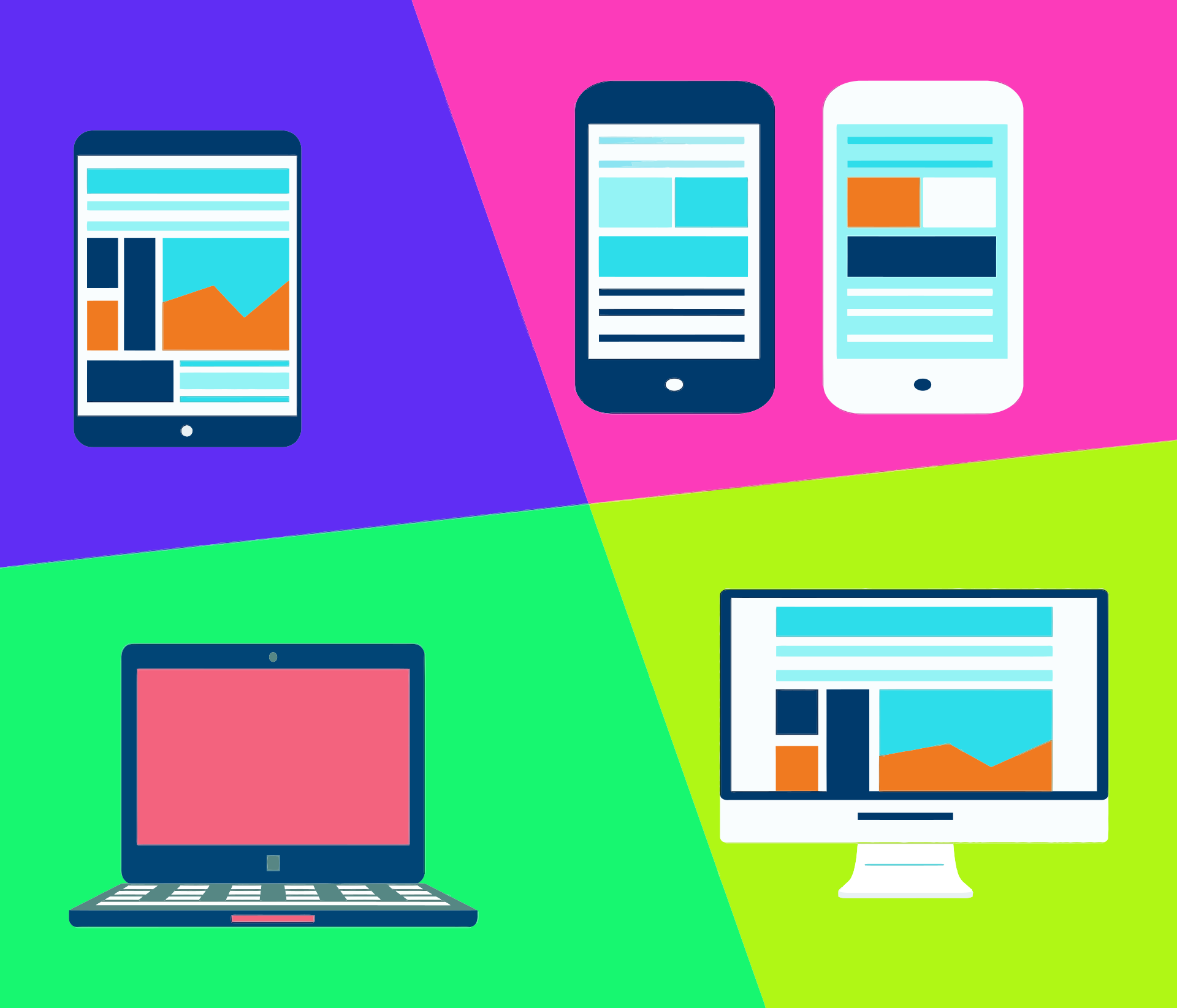 This showcases a variety of modern devices, including five different items. In the bottom left corner, there is an open laptop computer, while in the top left side, there is a tablet device. Two cell phones are displayed at the top right section of the image, and finally, a desktop monitor can be seen on the bottom right side. The colorful display of these devices highlights their diverse functions and purposes in today's technology-driven world.