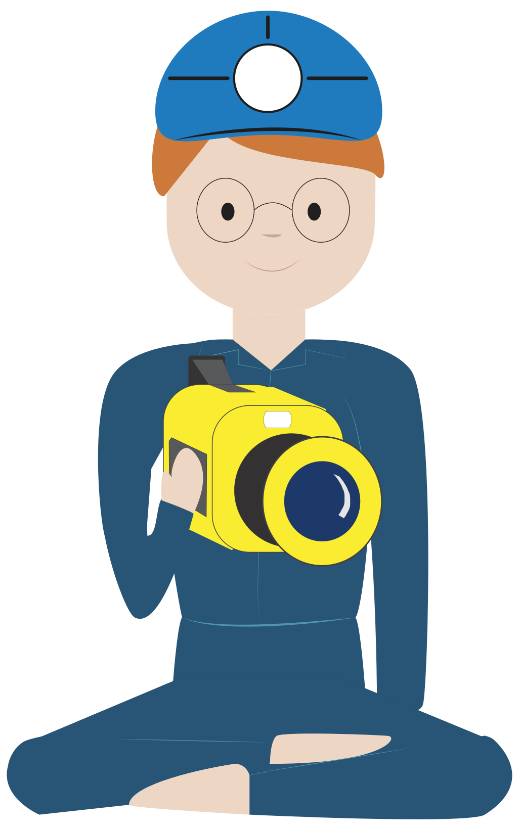 This features a cartoon character wearing a blue hat and holding a yellow camera. The character is sitting down, possibly on the floor or in a chair, with the camera held up to their face. The cartoon character appears to be smiling as they hold the camera, giving off a friendly and playful vibe. This image could be used for various purposes such as an advertisement, a children's book illustration, or even as part of a comic strip.
