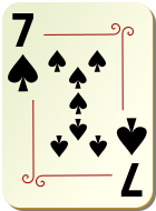 This features a deck of cards, specifically the number seven card. It is an ornamental playing card with hearts on it and has a red border around the edges. There are several hearts scattered throughout the card, some in the corners and others in various positions across the card's surface. This unique design makes for an interesting and eye-catching piece of art or decoration.