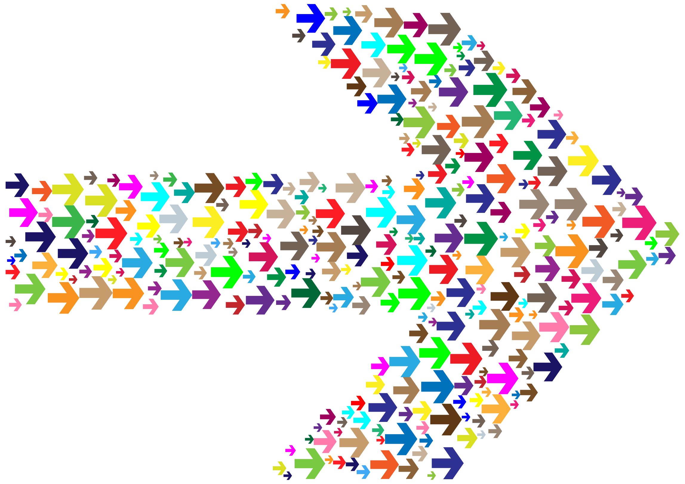 This features a large arrow made up of many smaller arrows. These smaller arrows are scattered throughout the scene, creating an interesting and visually appealing pattern. The arrows come in various colors, including pink, yellow, green, blue, and orange. They are arranged in such a way that they form a cohesive design, making it appear as though the arrow is made up of smaller arrows. This unique arrangement creates an eye-catching visual effect that draws attention to the arrow's shape and colorful components.