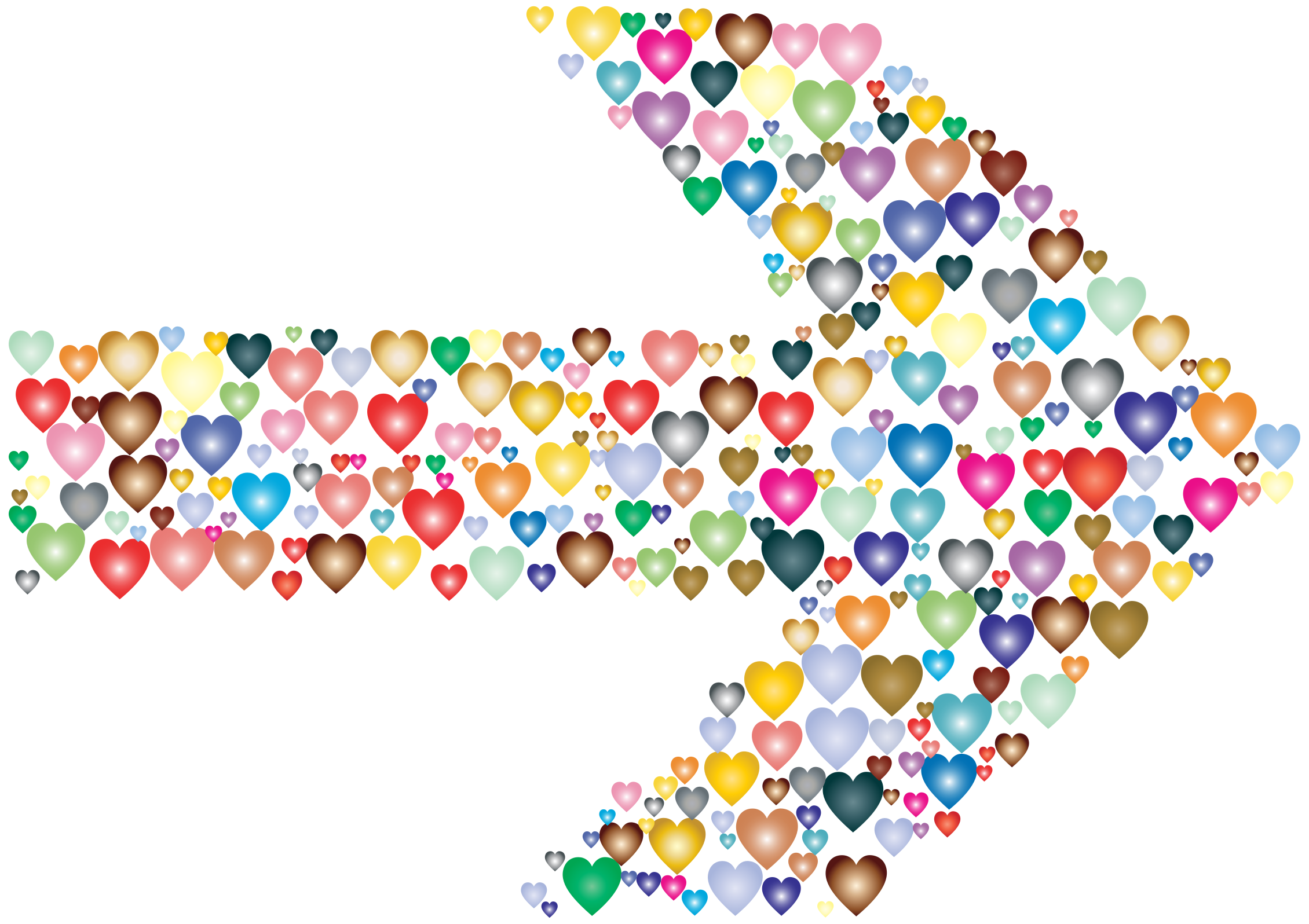 This features a white background with a large arrow made up of various colored hearts. The arrow is filled with different shades and sizes of hearts, creating an eye-catching and vibrant display. The hearts are scattered all over the arrow, filling in the spaces between its lines and giving it a unique and playful appearance. This creative design could be used for decoration or as a symbol to represent love, friendship, or other positive emotions.