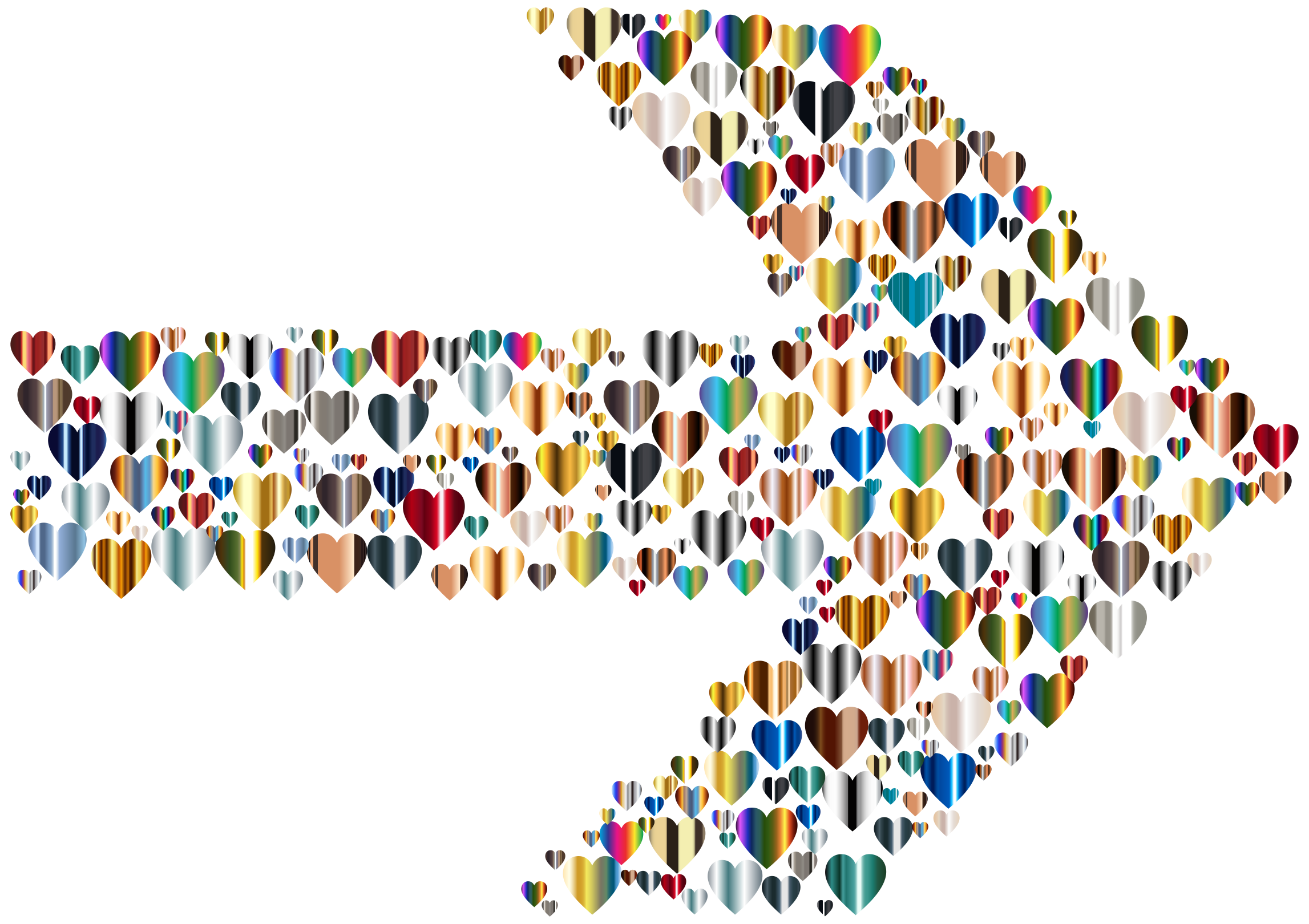 This features a white arrow with hearts on it, made up of various colored hearts. These hearts are arranged in different shapes and sizes, creating an eye-catching pattern that resembles a rainbow. The hearts are scattered all over the arrow, filling its entirety from top to bottom. This unique design showcases creativity and attention to detail, making it an interesting visual piece.