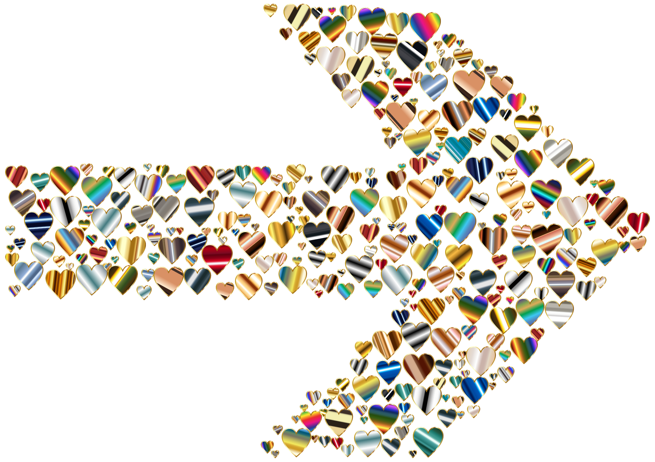 This features a white arrow with hearts and other shapes scattered all over it. These shapes are colorful, adding a vibrant touch to the scene. There is an abundance of hearts in various sizes and positions on the arrow, creating a visually appealing pattern. Additionally, there are several other shapes such as stars, squares, and triangles that contribute to the overall design. The combination of these elements creates a unique and eye-catching visual effect.