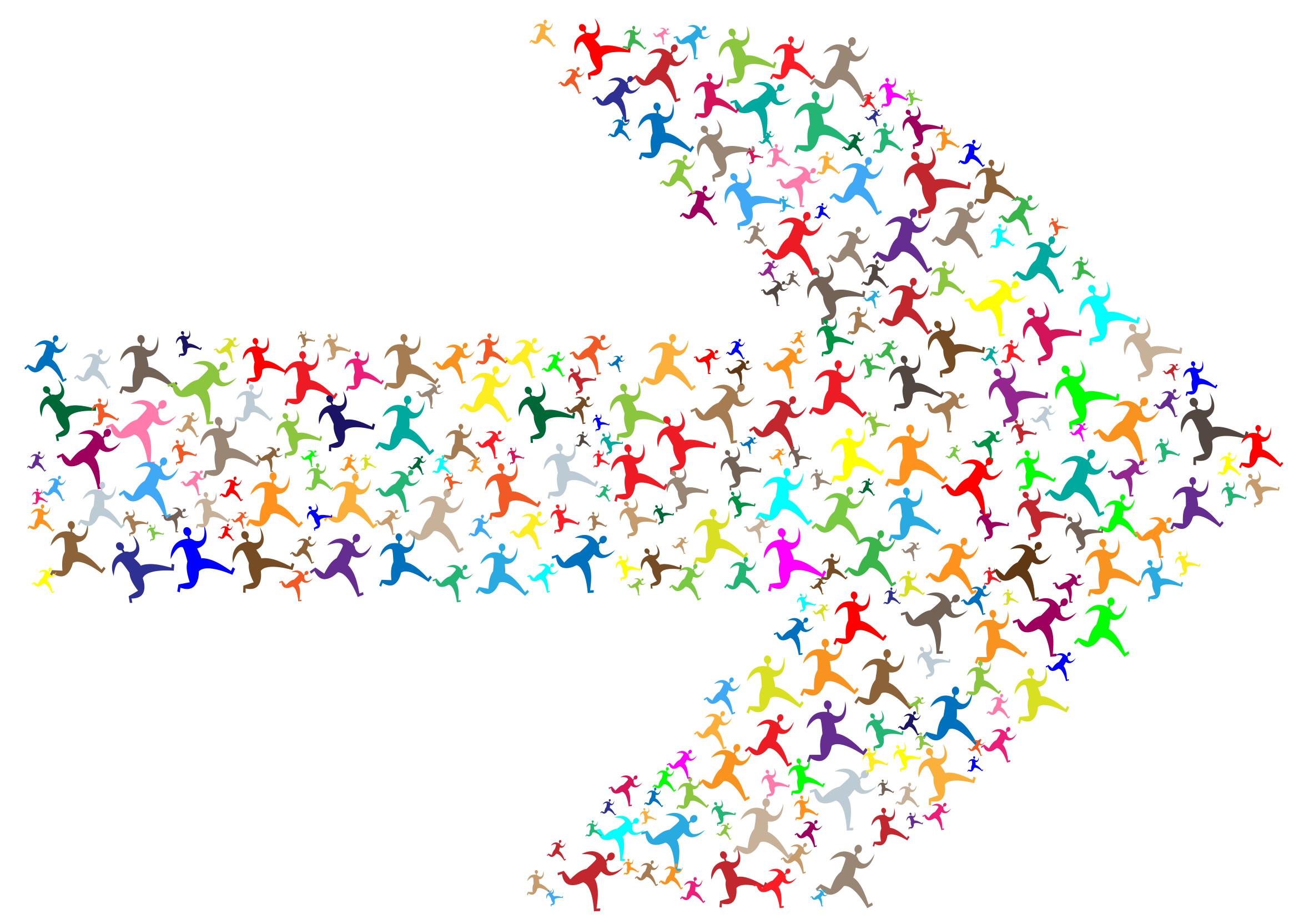 This features a large white arrow with many people walking in different directions. These individuals are scattered throughout the scene, creating a sense of movement and activity. There is a diverse range of colors among the people, adding visual interest to the overall composition. Some of these people can be seen closer to the arrow's tip, while others are positioned further away, giving the impression that they are all moving in different directions. The scene captures the essence of a bustling and dynamic environment where individuals are constantly on the go.