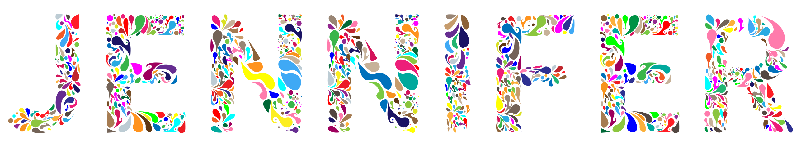 This is a close-up of the name Jennifer, which has been creatively arranged using various colorful shapes and letters. These shapes are scattered across the scene in different sizes and positions, creating an eye-catching visual effect. The arrangement of these shapes forms the word "Jennifer" in a unique and artistic manner. This type of typography is often used to create visually appealing designs or to convey a specific message or theme.