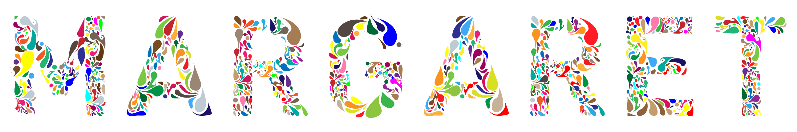 This is a close-up of the word "Margaret" written in various colors and fonts. The letters are arranged in a visually appealing manner, creating an interesting and artistic display. The different colors and styles of the lettering give the impression that this could be a piece of typography or a decorative design element. Overall, it is a creative representation of the name "Margaret."