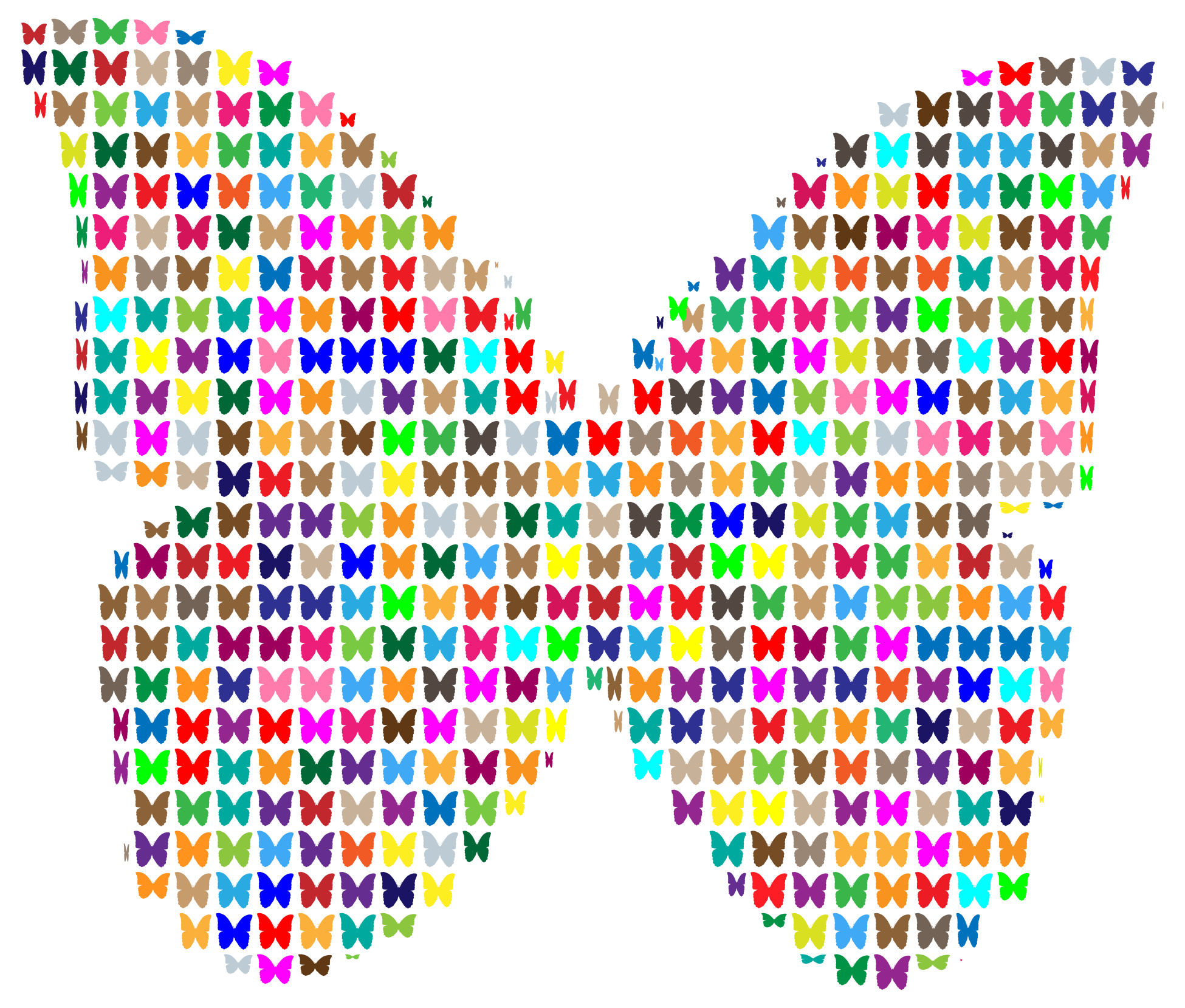 This features a large, colorful butterfly made up of many smaller butterflies. These smaller butterflies are arranged in various positions and colors, creating an eye-catching pattern that resembles the wings of a real butterfly. The arrangement of these smaller butterflies gives the impression of a single, larger butterfly, showcasing the intricate details and vibrant hues present in each individual piece. This artistic display is likely intended to evoke feelings of beauty and harmony with nature.