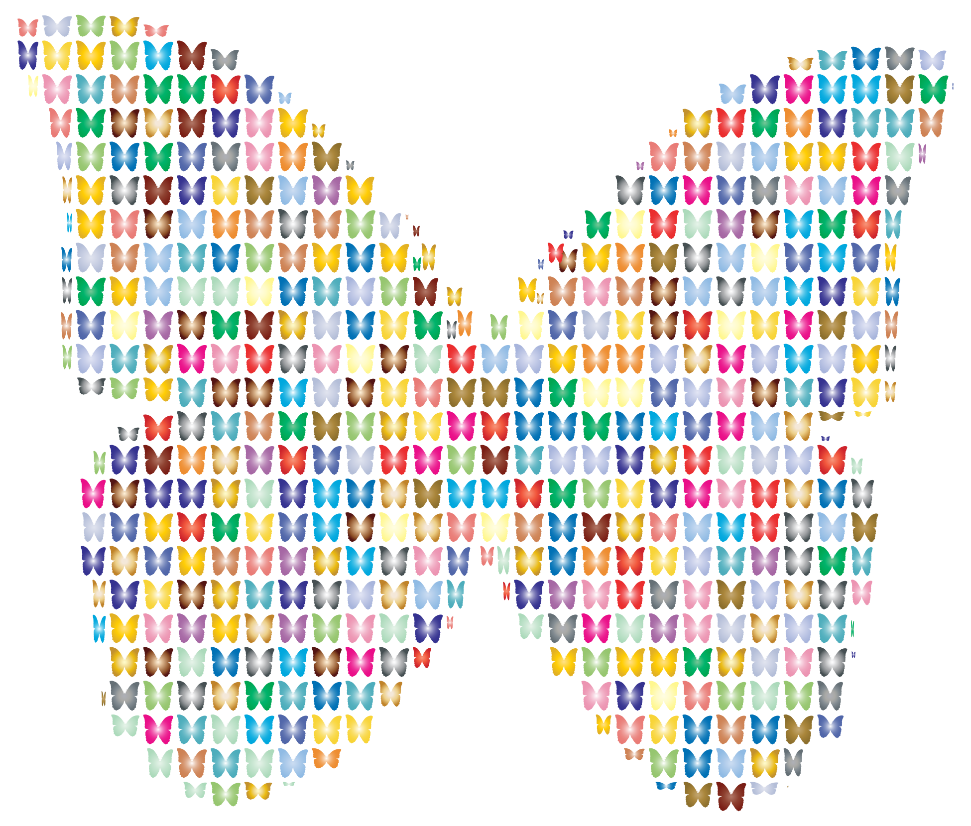 This features a large, colorful butterfly made up of many smaller butterflies. These smaller butterflies are arranged in various positions and colors, creating an intricate and visually appealing pattern. There is a wide variety of butterflies used to form the larger butterfly, with some appearing more prominent than others. The overall effect is a striking representation of nature's beauty through the use of different colored and shaped butterflies.
