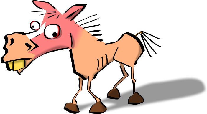 This features a cartoon horse with an exaggerated expression on its face. It appears to be making a funny or silly face, possibly due to the way it is drawn. The horse has a large mouth and teeth, which adds to the comical nature of the scene. In addition to the horse's facial features, there are two small dots in the background that might represent other elements within the image. Overall, this cartoonish drawing creates an amusing and lighthearted atmosphere.