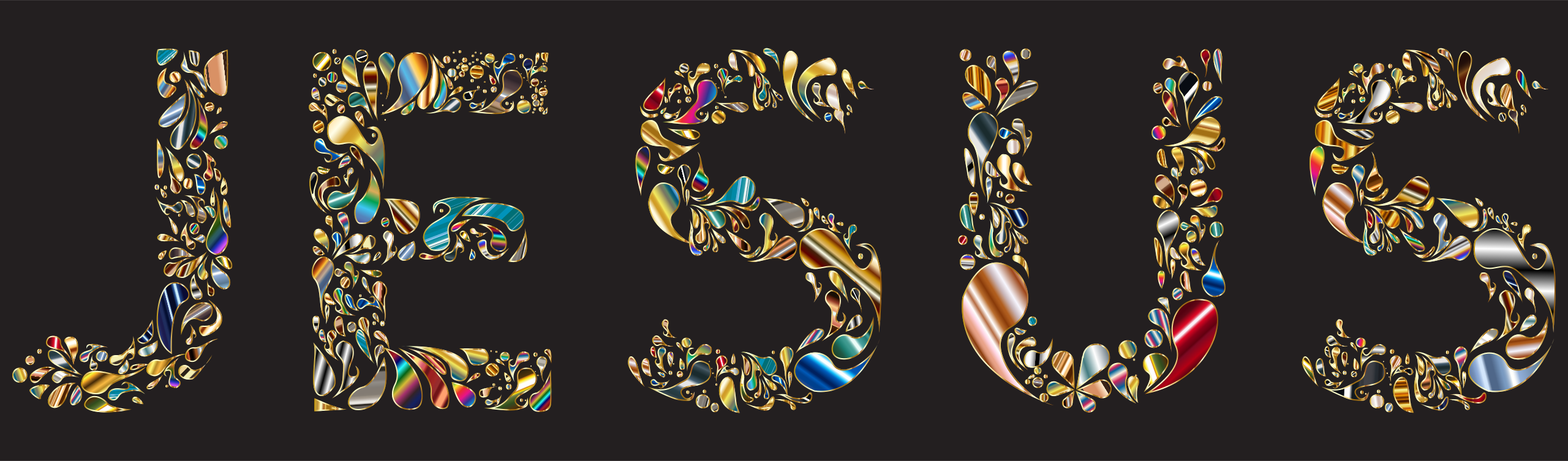 This features a large poster with the word "Jesus" written on it. Instead of using traditional letters, the word is made up of small colorful spots arranged in such a way that they form the word "Jesus." This unique and creative approach to displaying the name of Jesus makes for an interesting visual display. The poster's black background serves as a striking contrast against the vibrant colors of the spots, drawing attention to the message it conveys.