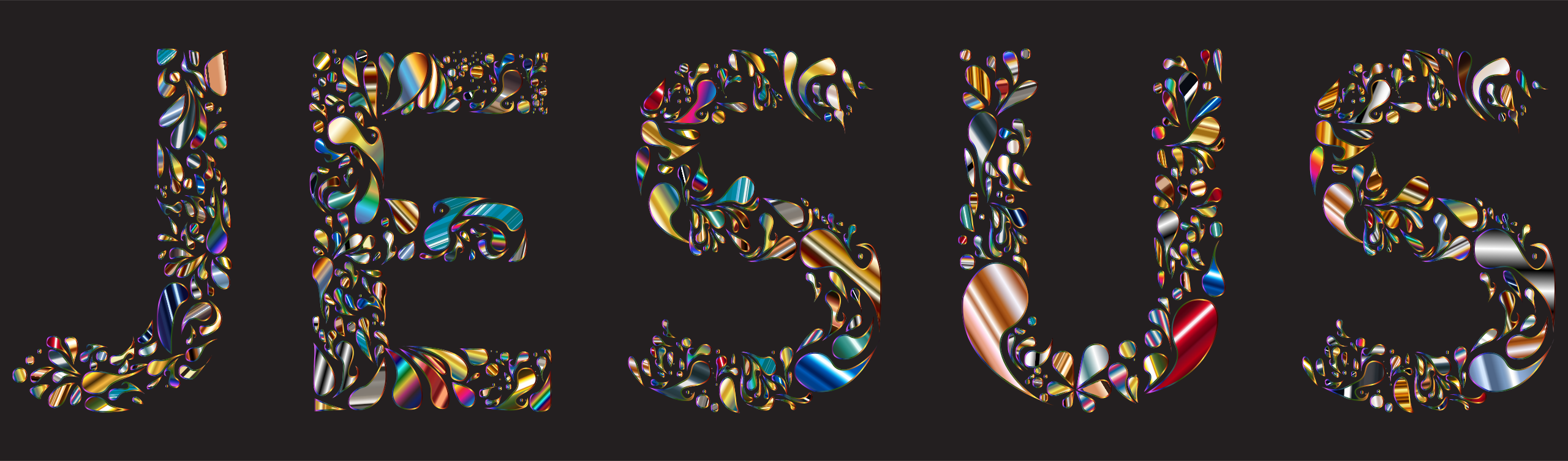 This is a close-up of the word "Jesus" written in large letters. The letters are colorful and appear to be made up of various shapes, giving it an artistic appearance. The word "Jesus" is displayed prominently on the screen, with each letter taking up a significant portion of the image. This creative display of text can evoke feelings of inspiration or devotion for those who view it.