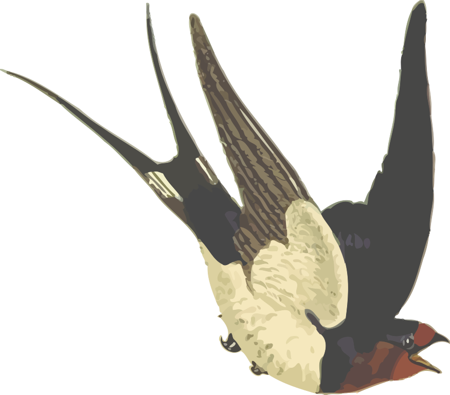 This features a beautifully drawn illustration of a bird, possibly a barn swallow, with its wings spread wide. The bird is flying downwards and appears to be in motion. Its wings are open, showcasing the intricate details of the feathers. The bird's body is predominantly brown and white, with a red face that stands out against the rest of its plumage. This artistic representation captures the essence of the bird as it soars through the sky.