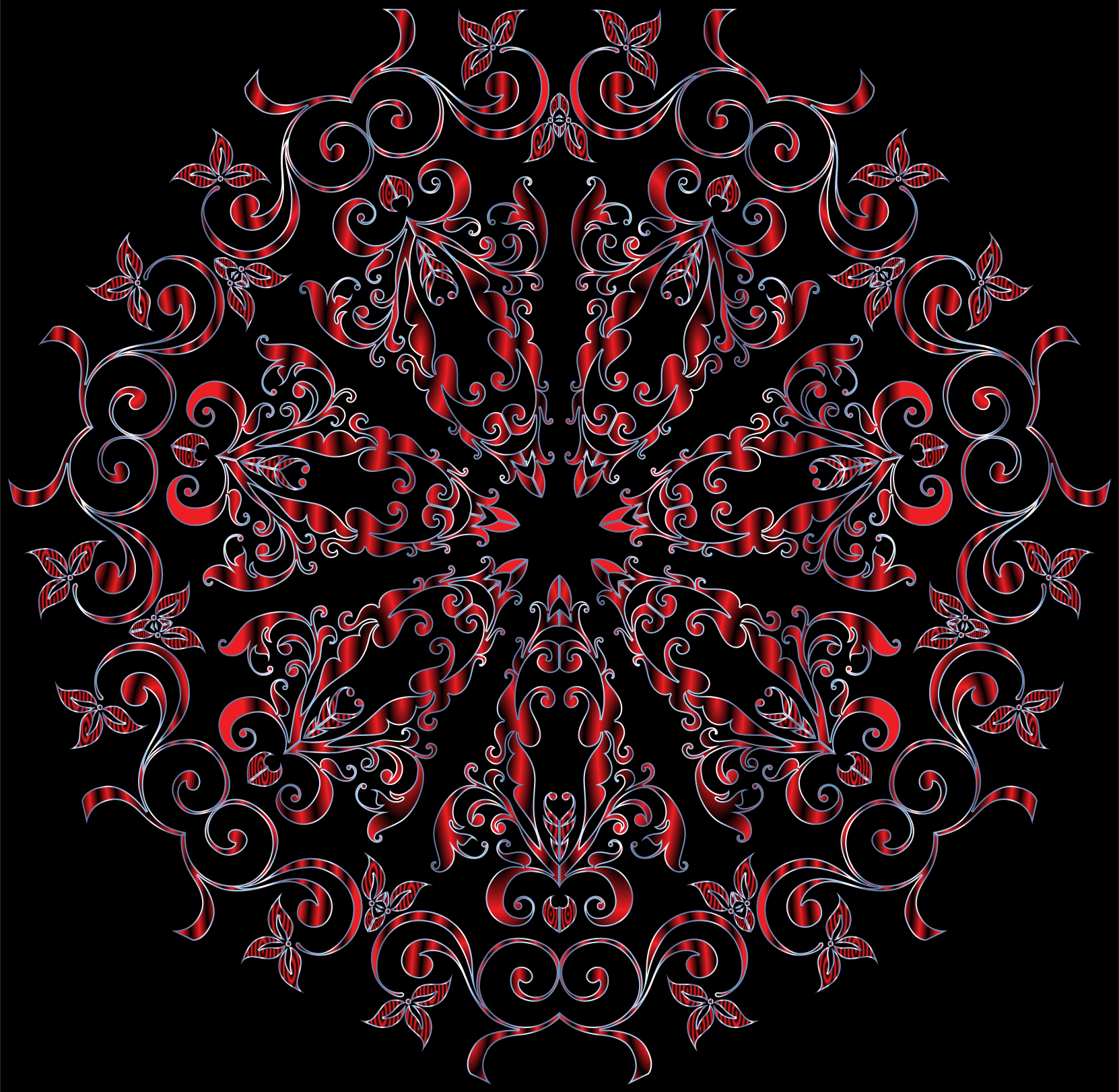This features a large, intricate design with red and black colors. It appears to be an ornate pattern or a decorative piece that could be used as wallpaper or a textile design. The design is composed of various shapes and patterns, including swirls and other geometric elements. These shapes are arranged in a circular formation, creating a visually striking centerpiece for the image. Overall, the design showcases an artistic and creative approach to decoration.