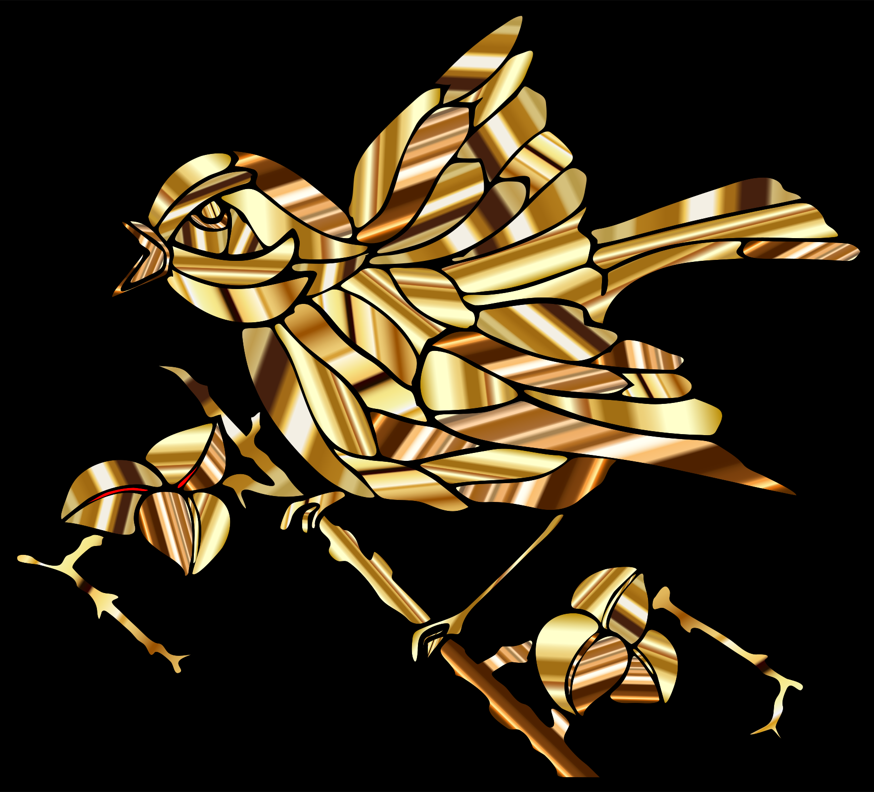 This features a beautifully crafted bird, possibly a goldfinch or a robin, perched on a branch. The bird is the main focus of the scene and appears to be looking upwards. The branch it's sitting on has an intricate design with leaves surrounding the bird, adding depth and detail to the image. The overall composition creates a sense of harmony between nature and artistic expression.