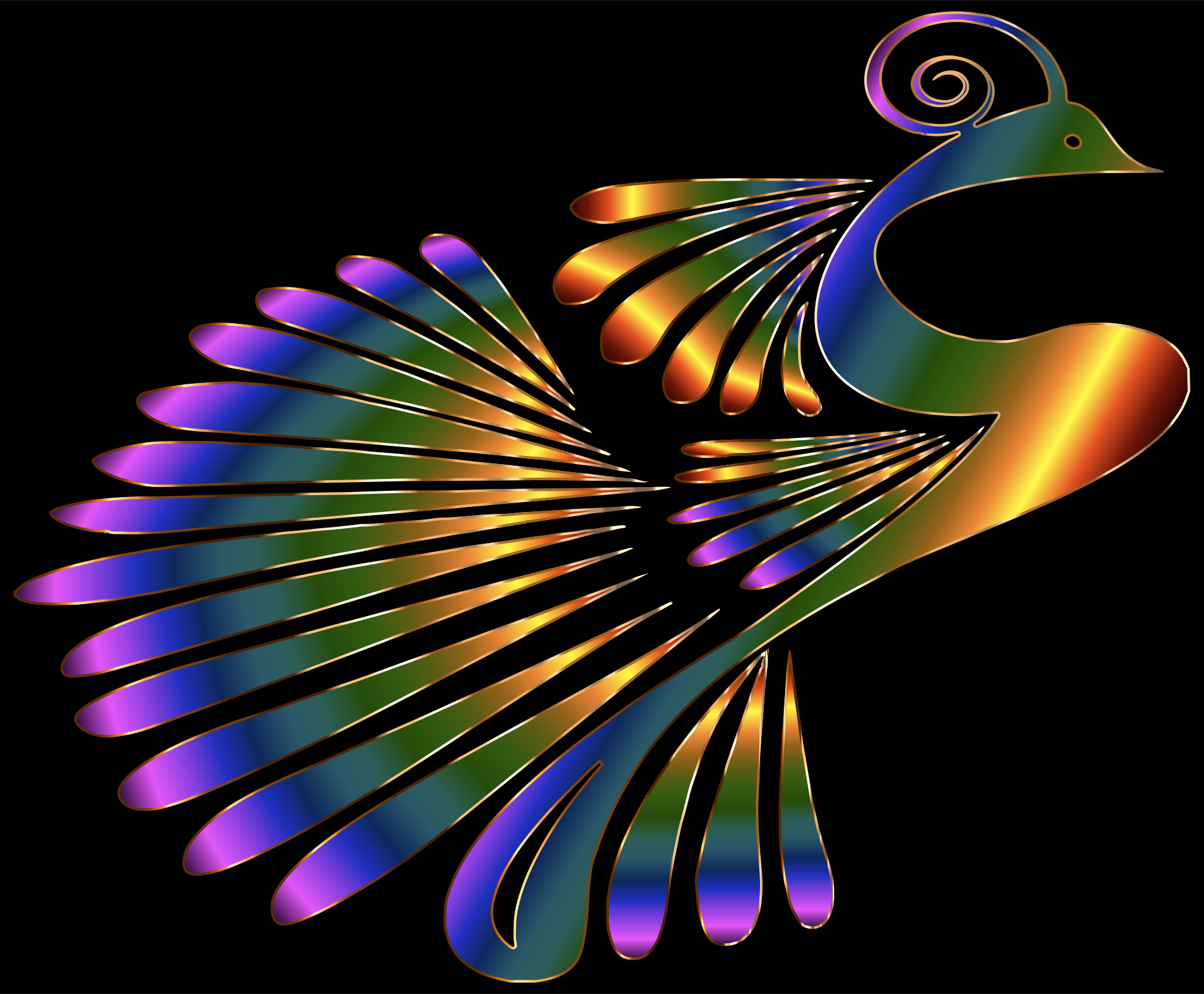 This features a colorful bird with long, rainbow-colored feathers. It appears to be a stylized or abstract representation of the bird, as it is not an actual photograph. The bird's wings are spread wide, showcasing its vibrant colors and intricate patterns. The overall effect is visually striking and captivating, with the bird taking up most of the image from left to right.