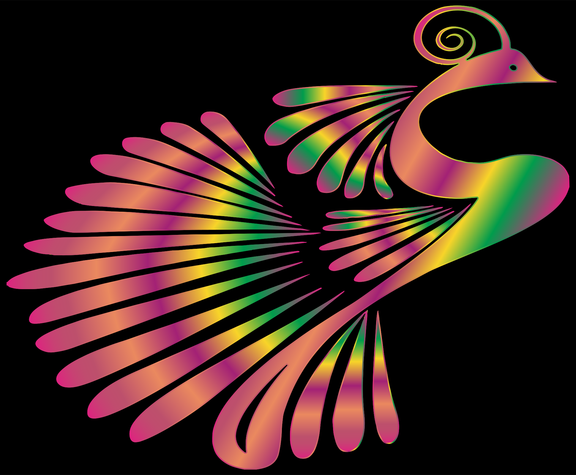 This features a colorful bird with long, flowing feathers. It has a rainbow-colored tail and wings that are adorned with swirls. The bird's head is turned to the side, giving it an interesting appearance. The vibrant colors of the bird create a lively atmosphere in the image.